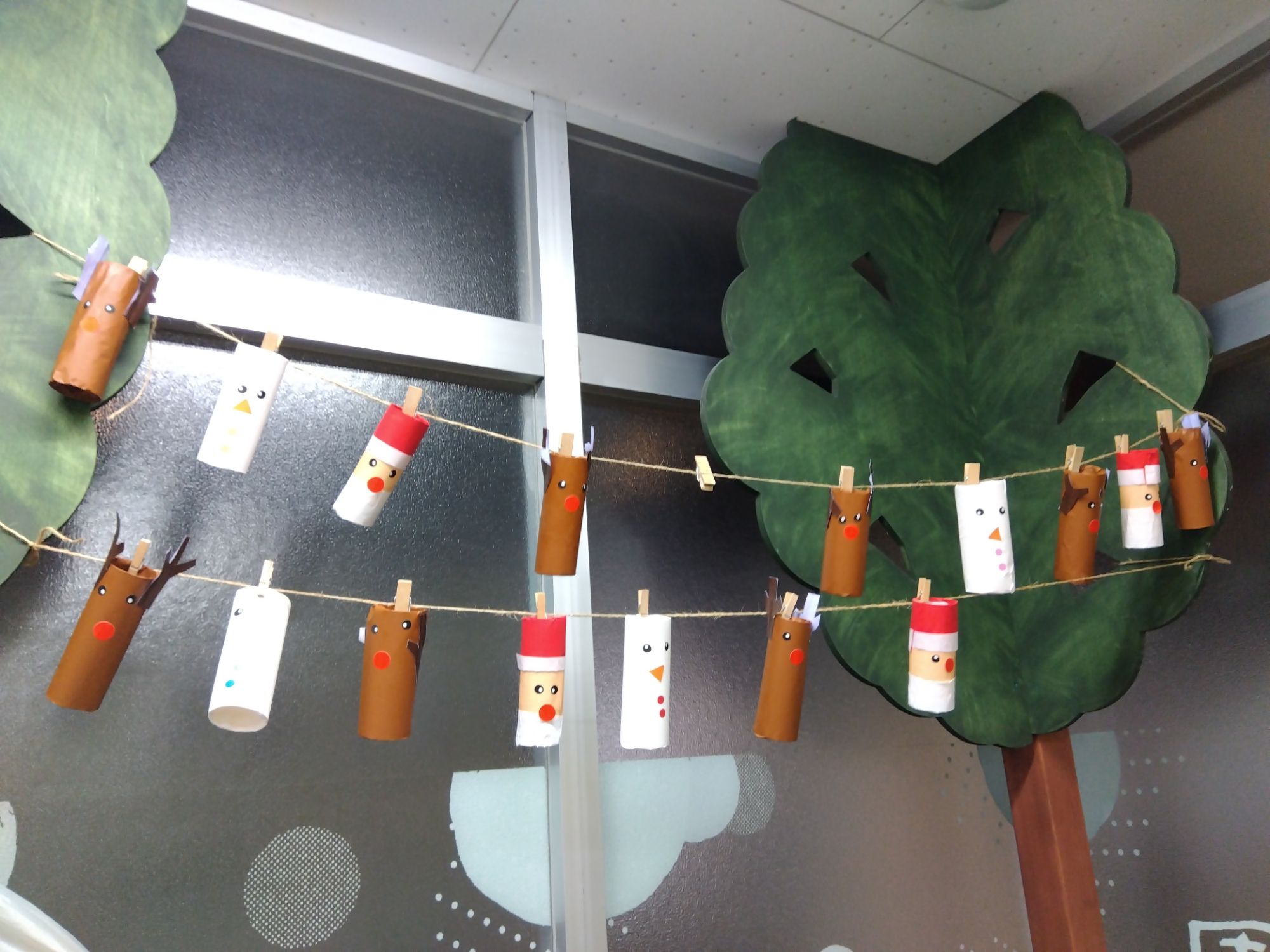英語ではトイレットペーパーを使って雪だるま、トナカイ、サンタクロースを作りました🧑🎄