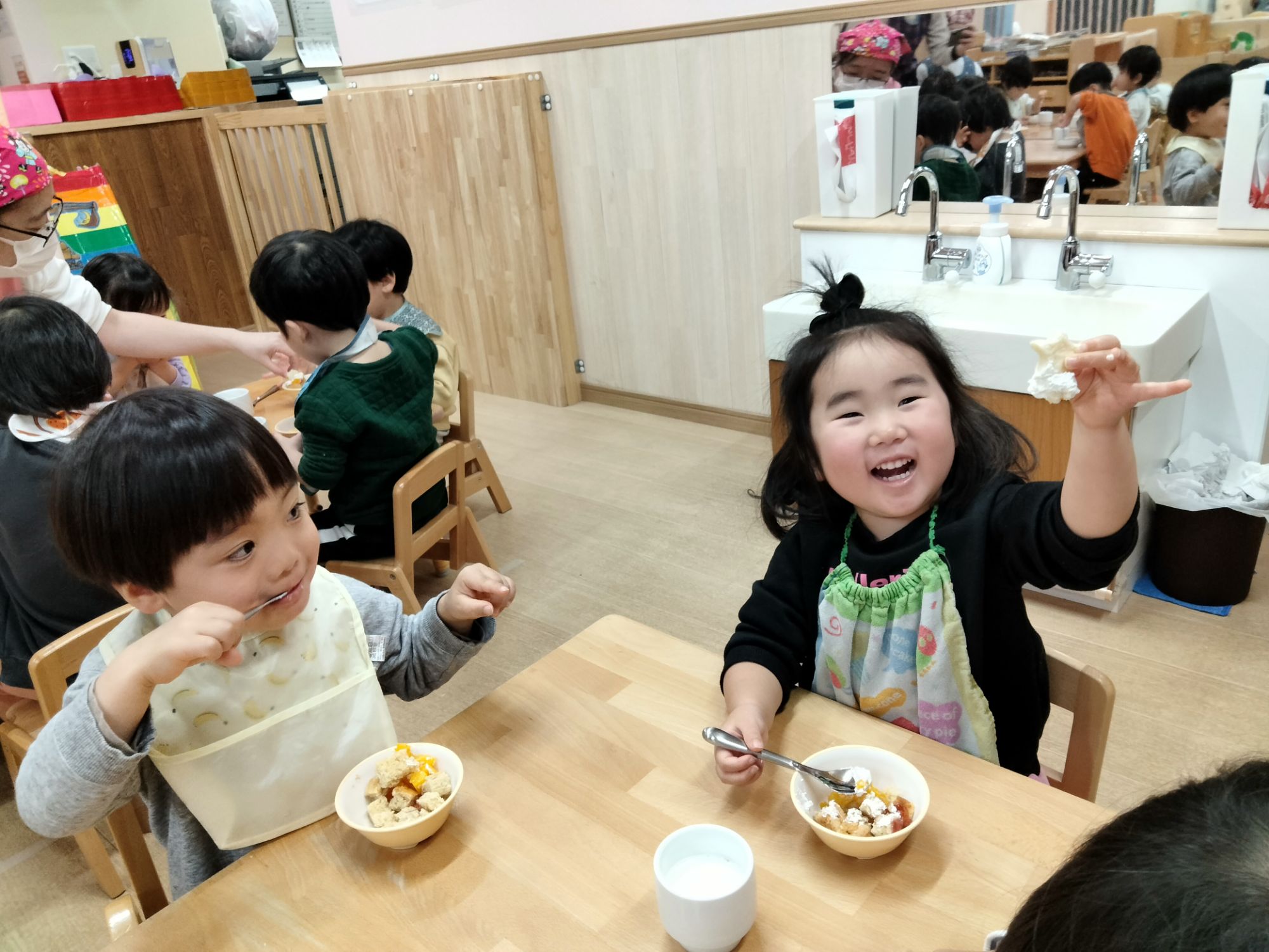 おひさま組さんのお友だちもニコニコ笑顔で、美味しそうにおやつを食べていましたよ☺️