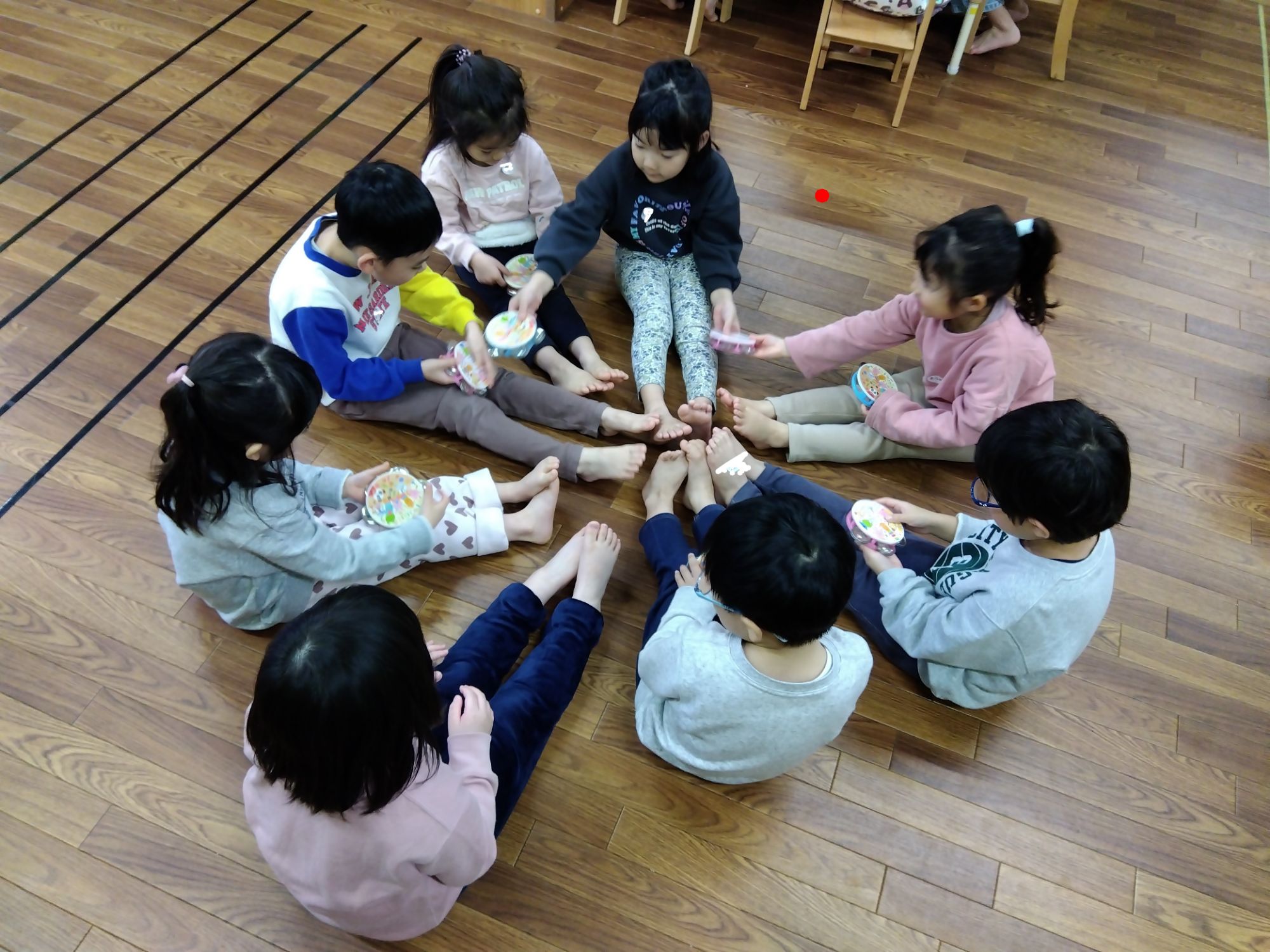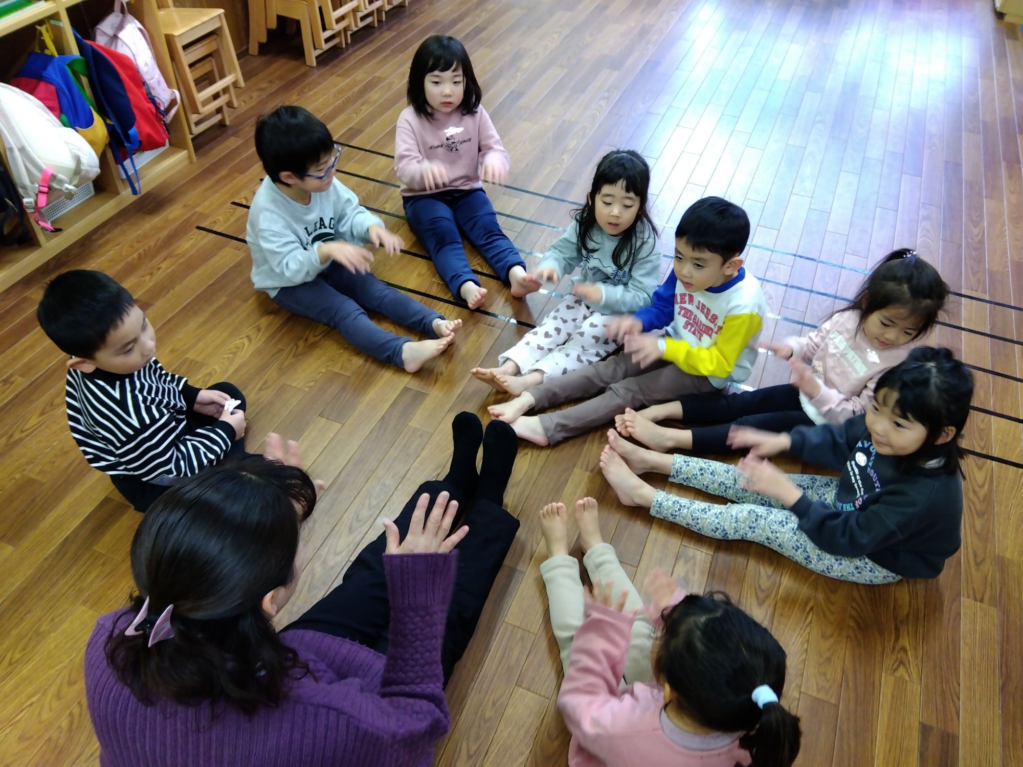 みんなでお膝をトントンして、『どうぞ』の時に、お隣の膝をトンとします。歌って、リズムをとって…大忙しですがお友達との触れ合いににこにこ😊な子どもたち。