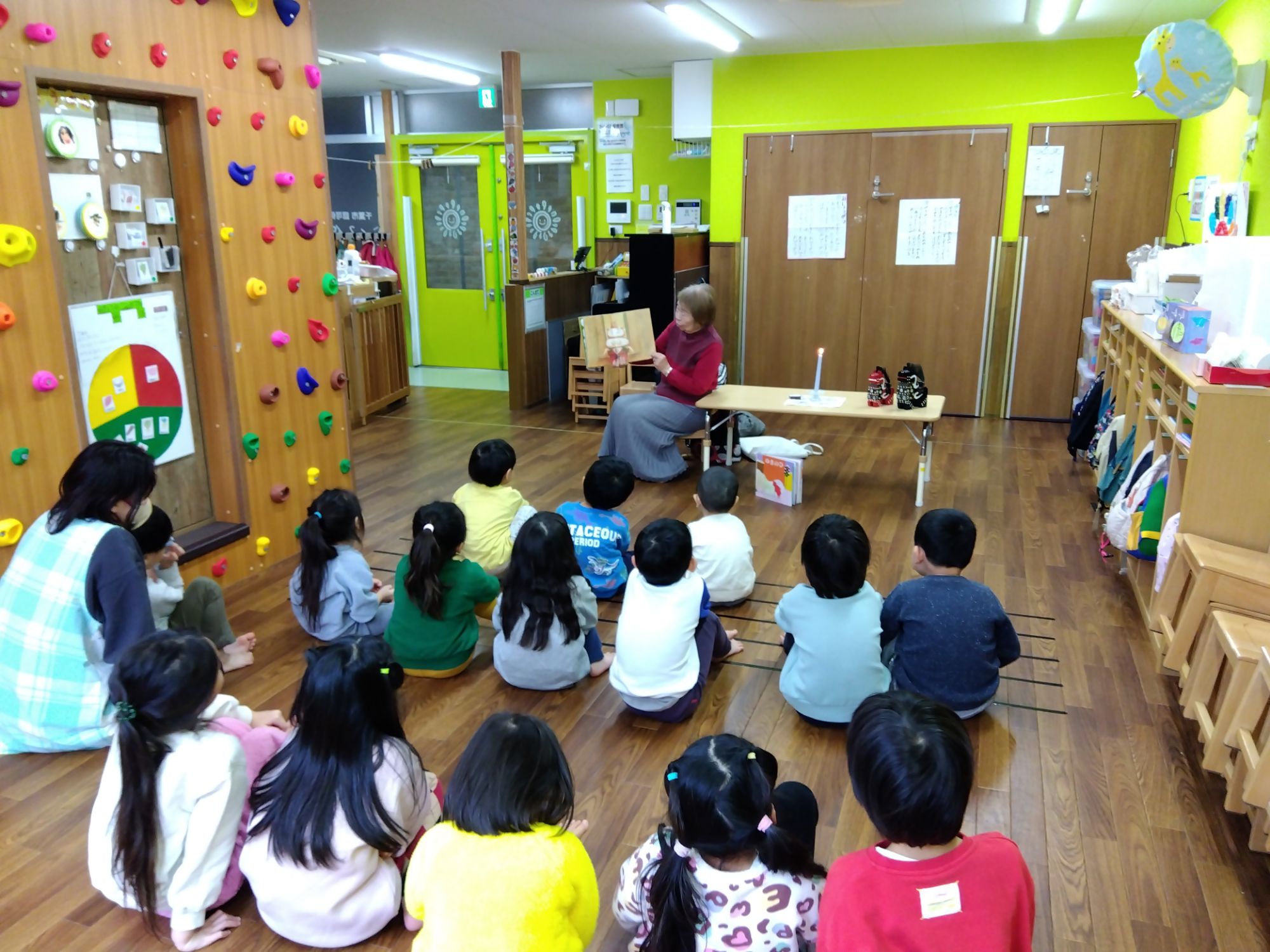 お話の世界に連れていってくれるロウソク🕯️は1月生まれのお友達が代表して…みんなの願いを込めて『ふぅ〜』 灯が消えたらお話の世界はおしまい!