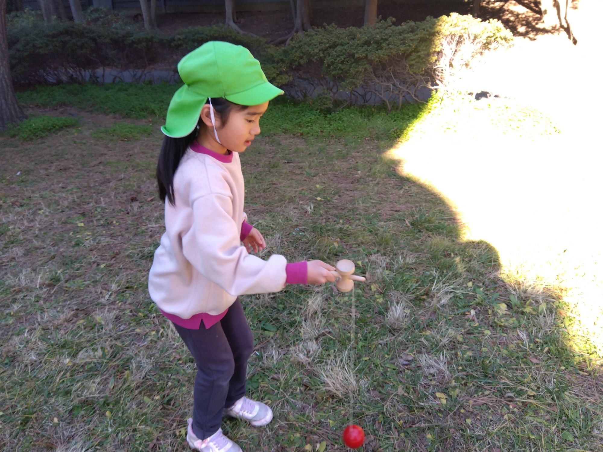 こちらは『けん玉』です。膝を使って〜ポン… なかなか難しいです😢