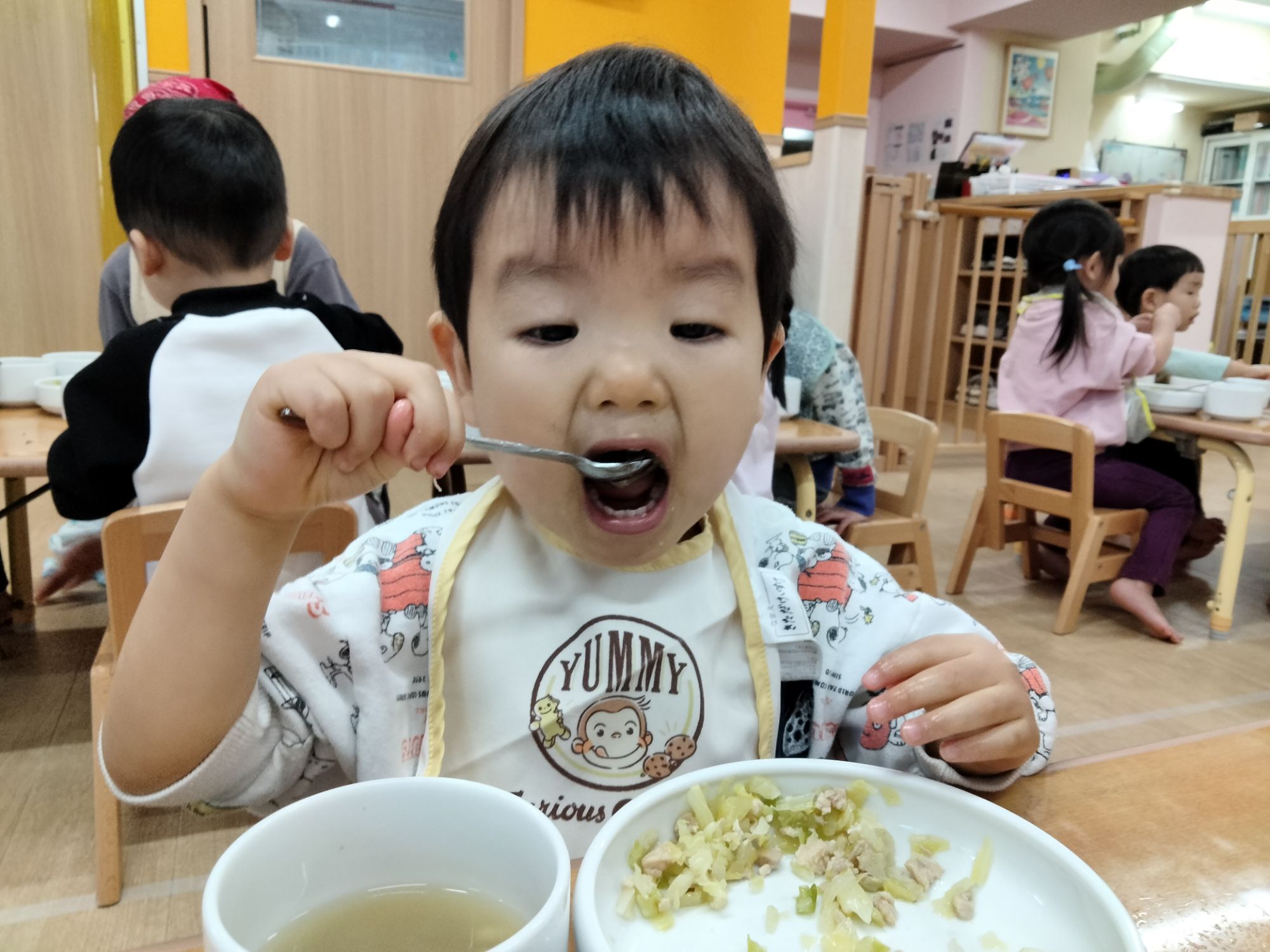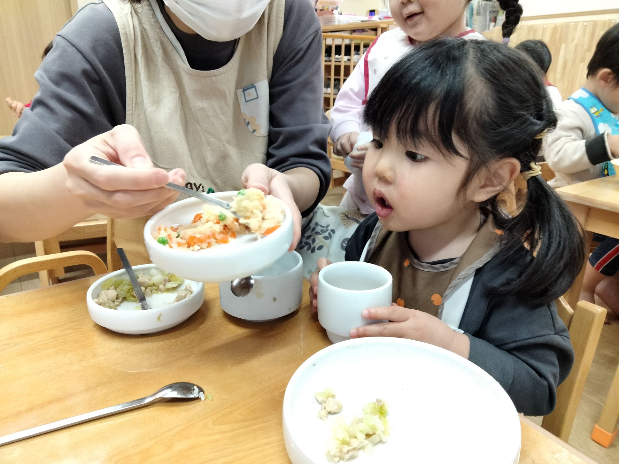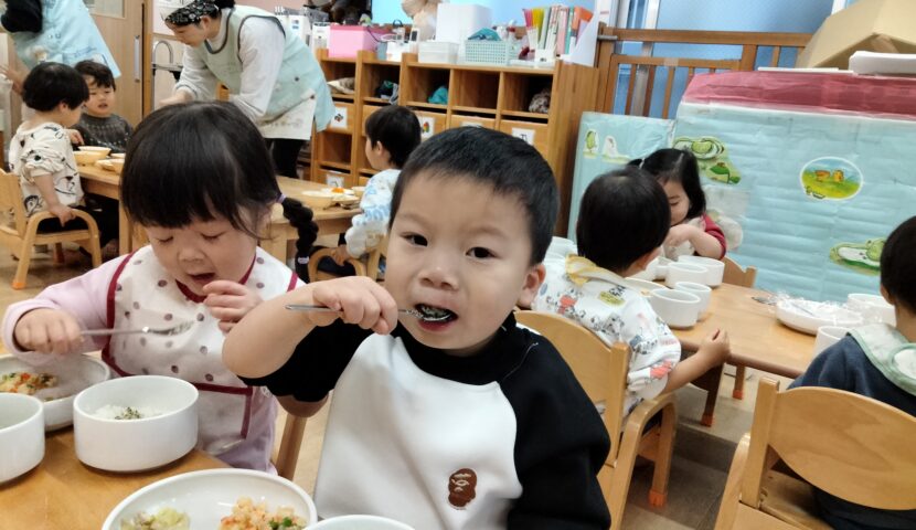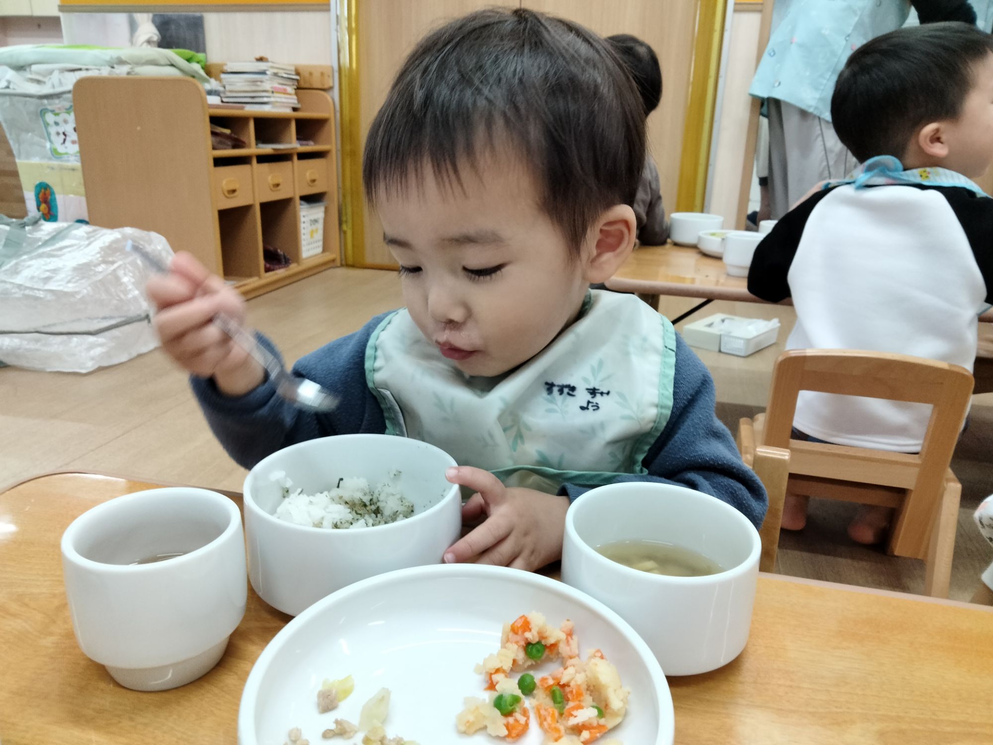 スプーンを上手に使いながら食べたり、保育者とお喋りしながら食べたり…美味しそうにご飯を食べていた子ども達でした✨️