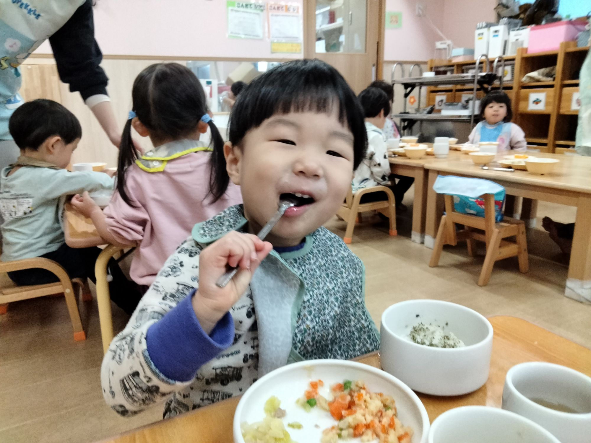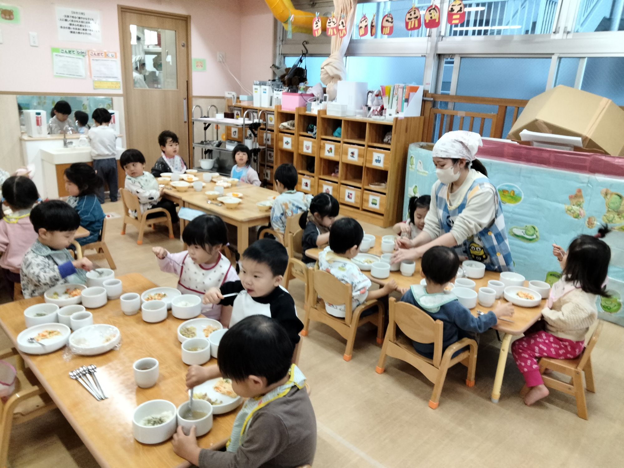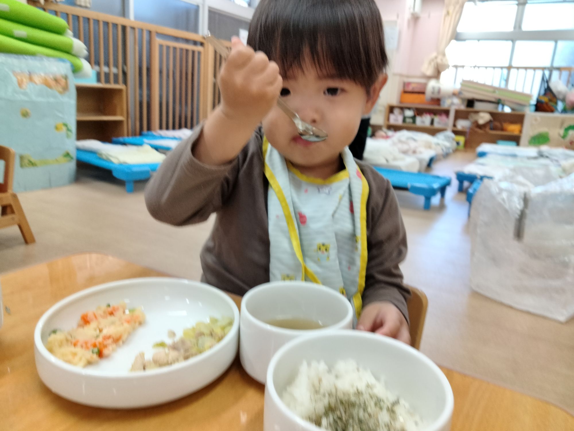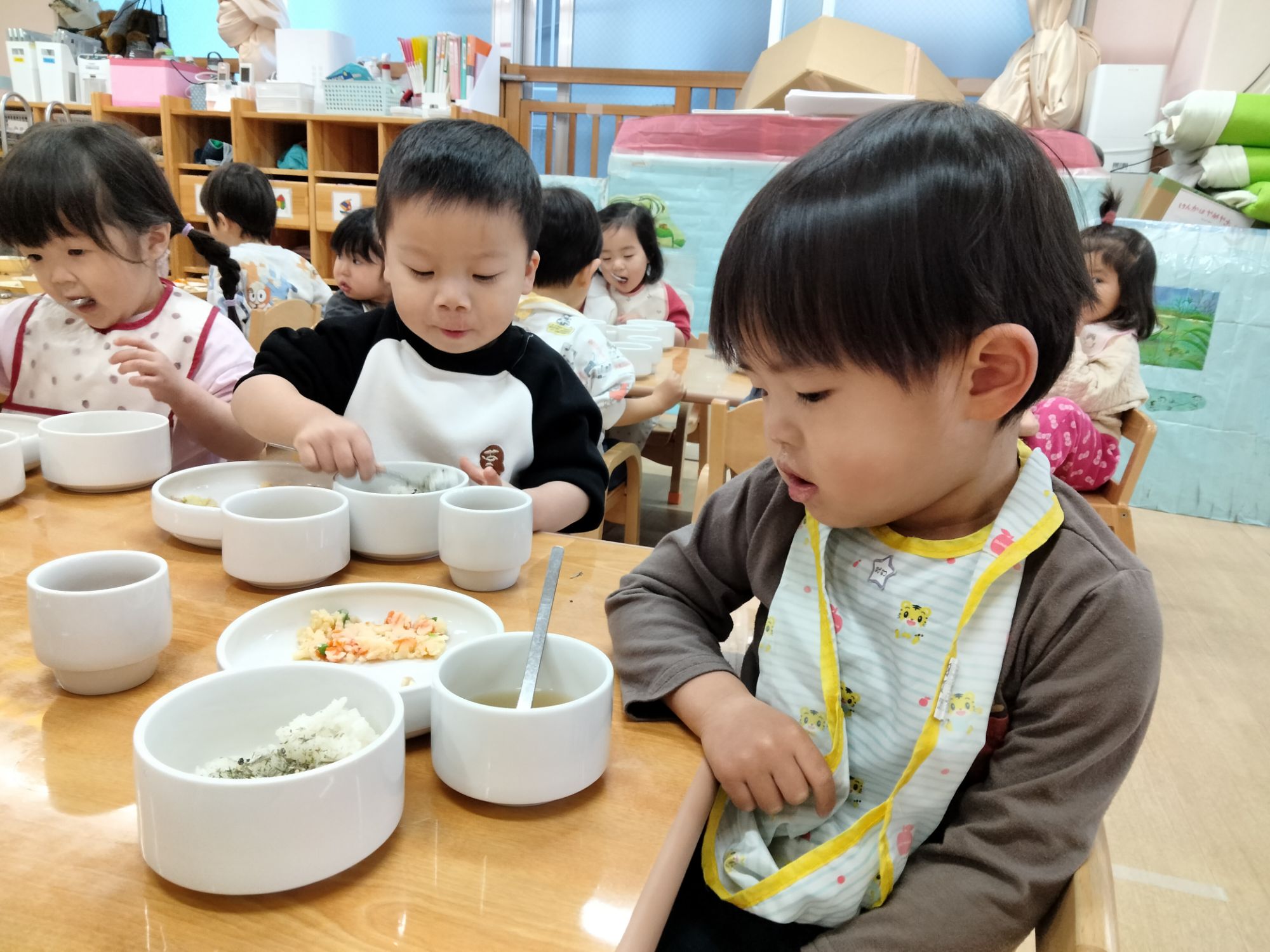 スプーンを上手に使いながら食べたり、保育者とお喋りしながら食べたり…美味しそうにご飯を食べていた子ども達でした✨️