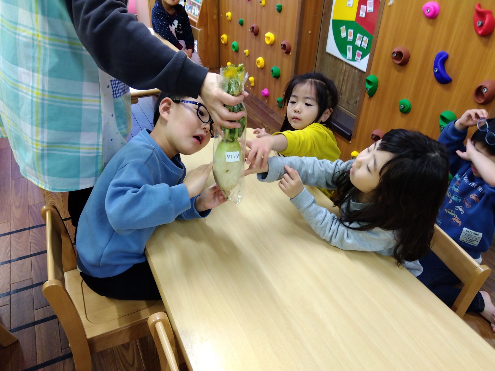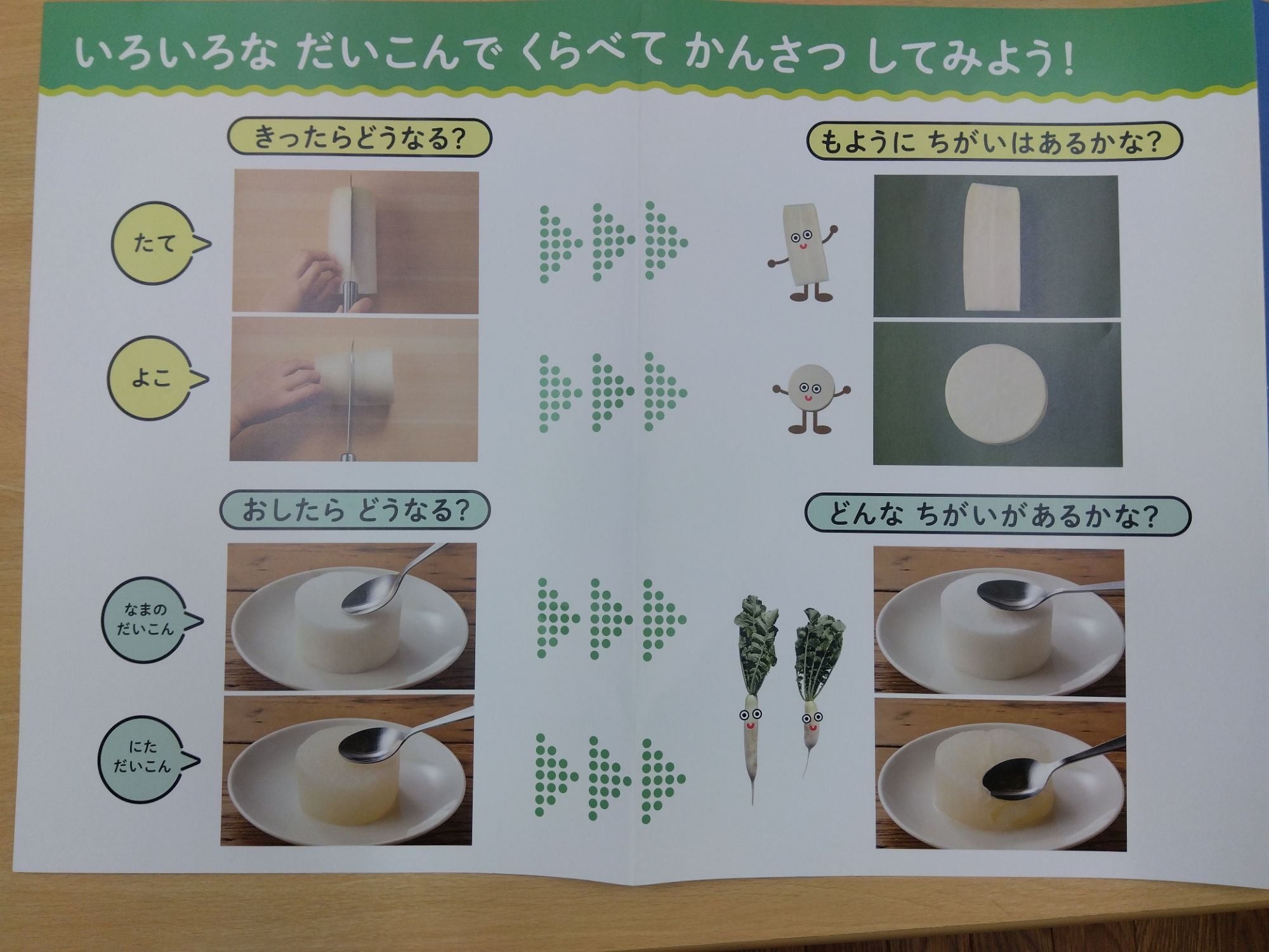 大きさ、形、切り方が違ういろいろな大根で比べて違いは何かな?興味津々でみて話を聞いています!!