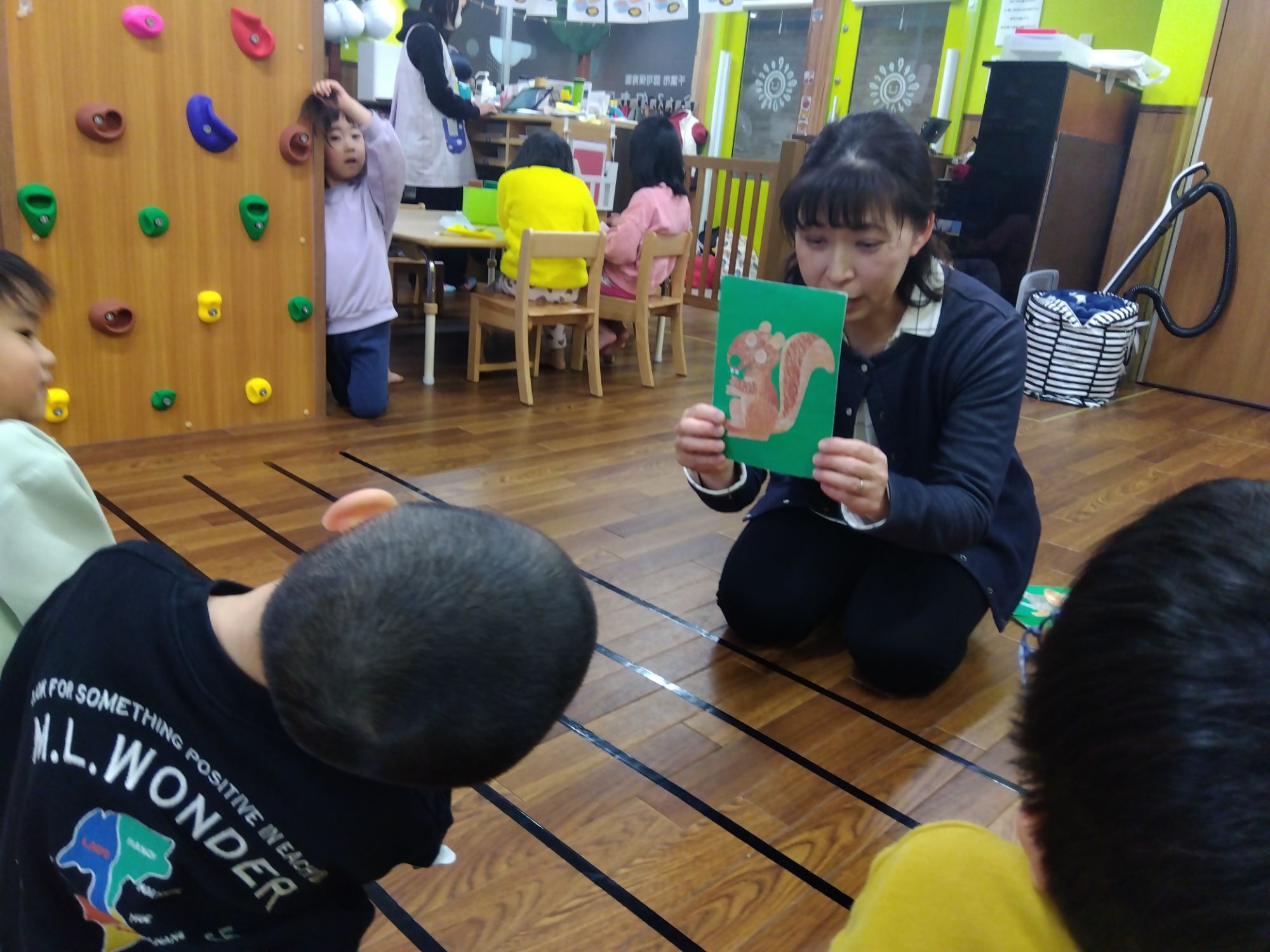 講師のピアノの音に合わせて、カードを持っているお兄さんの周りをリズムを取りながら回ります。