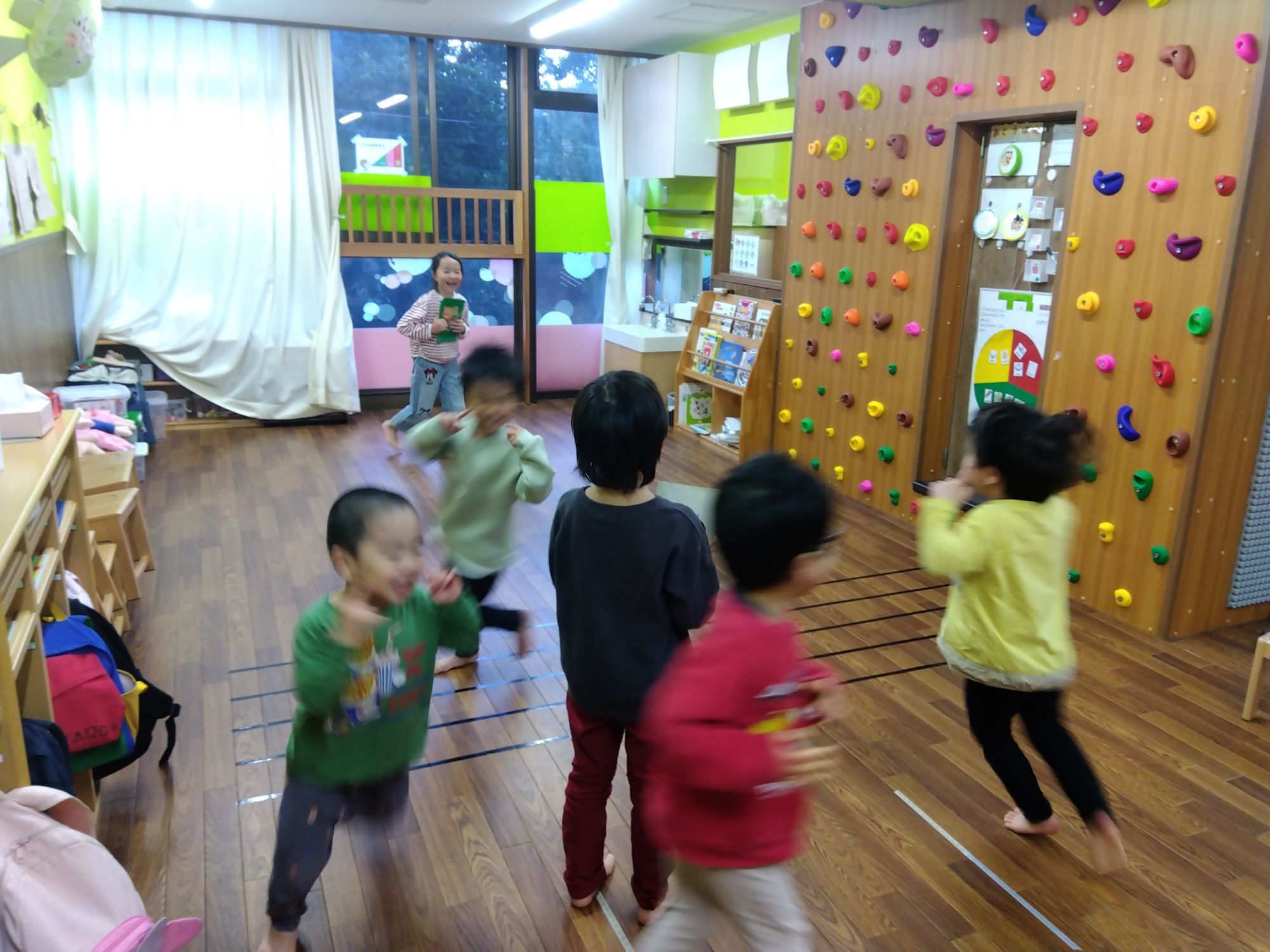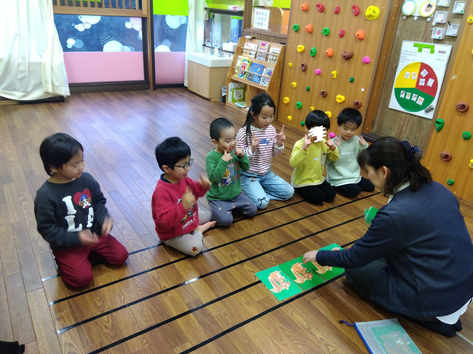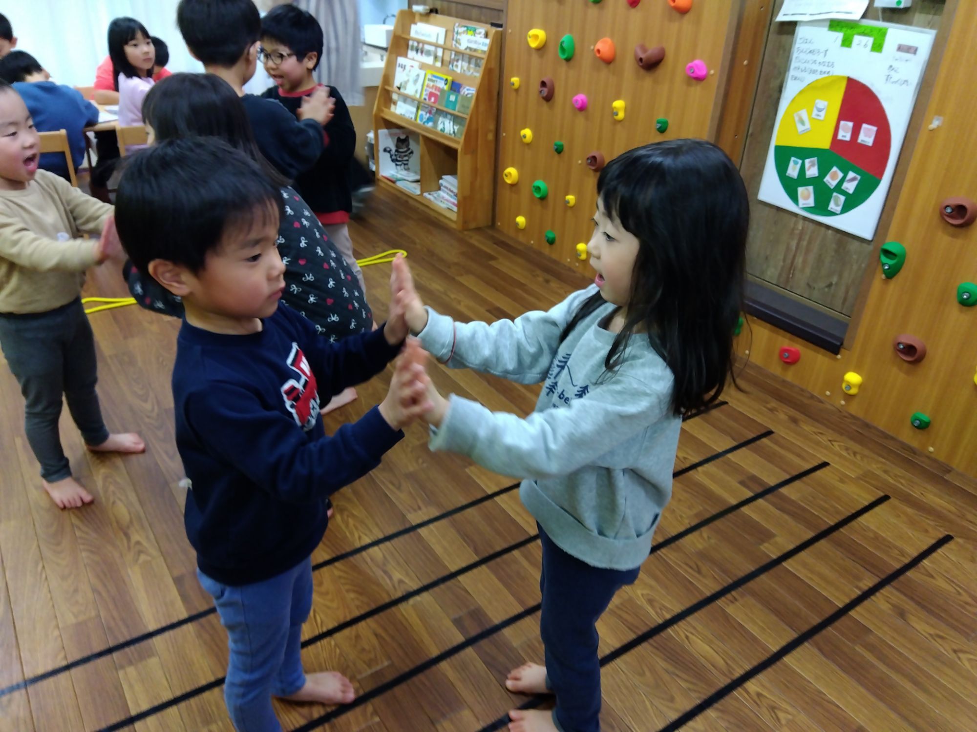 きらぼし組さんとも一緒にリズム遊びです。もうすぐきらぼし組さんになる子どもたち、お姉さん、お兄さんと一緒にきらぼし組さんのリズムを教えてもらいました👍🏻