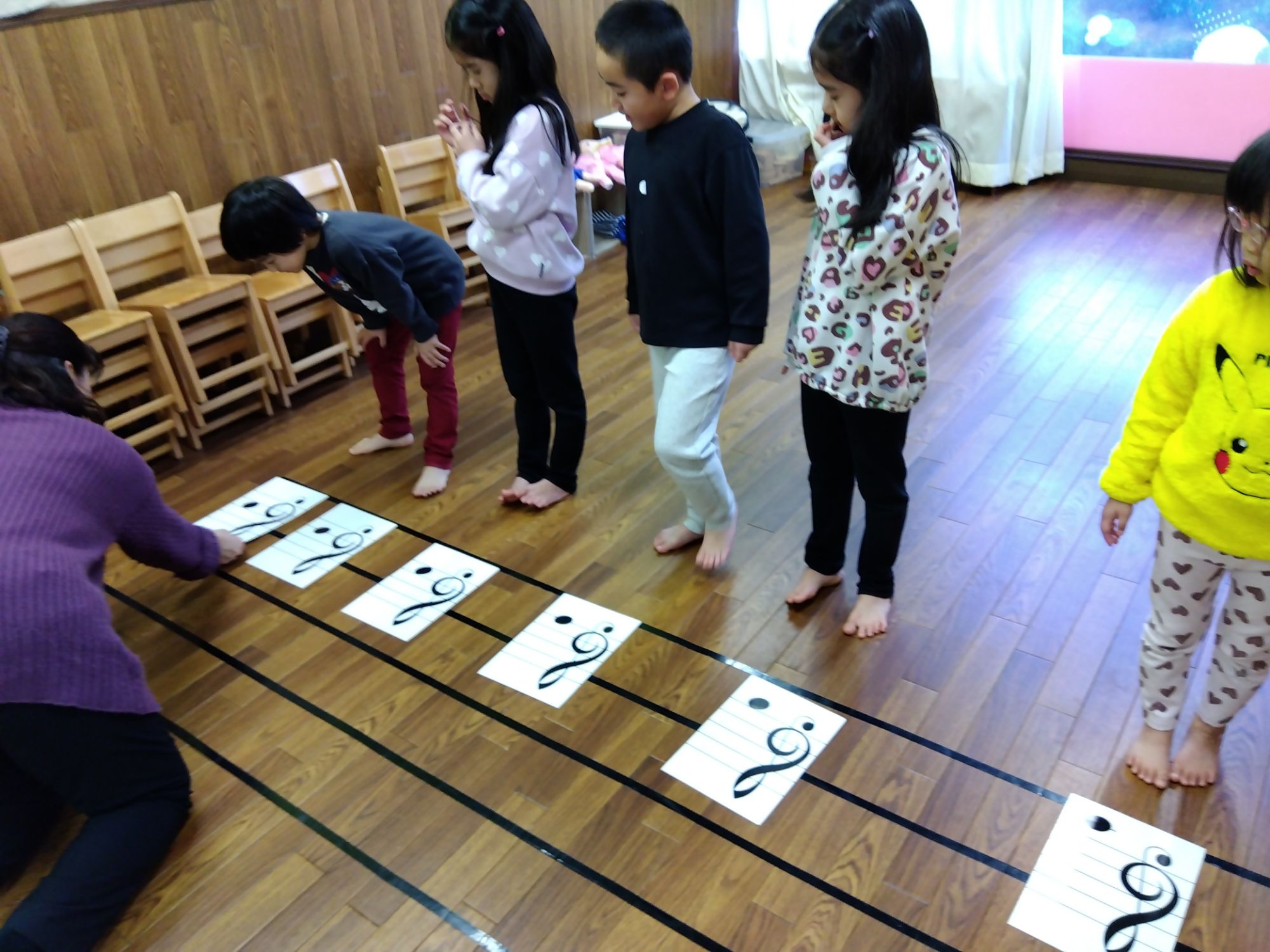 音階です「この音は?」子どもたちは身体の音階で表します。
