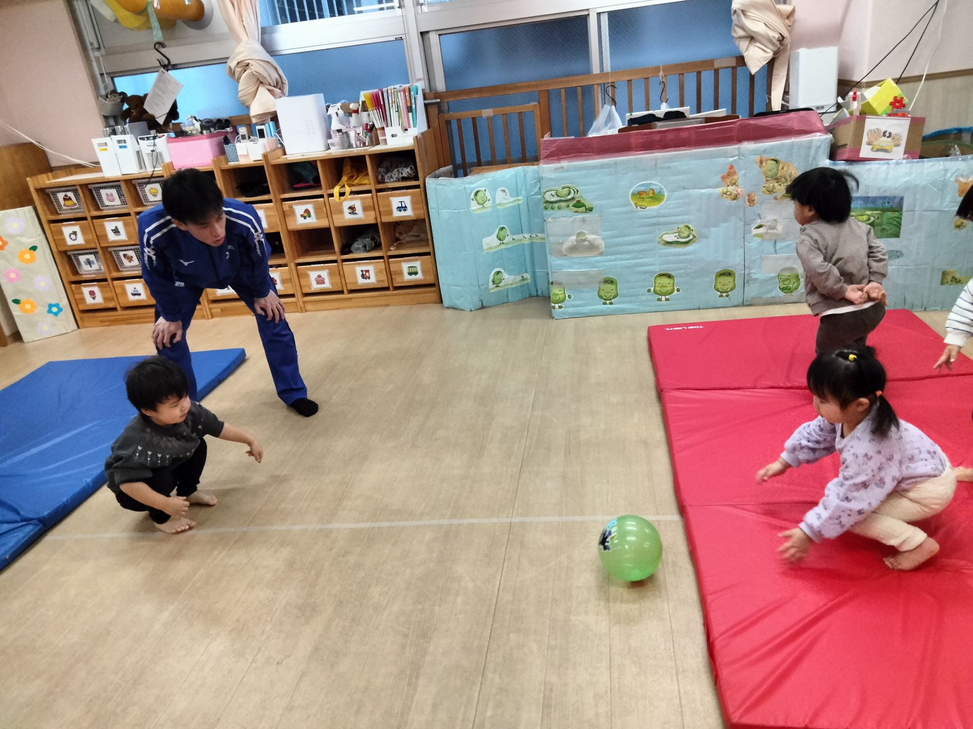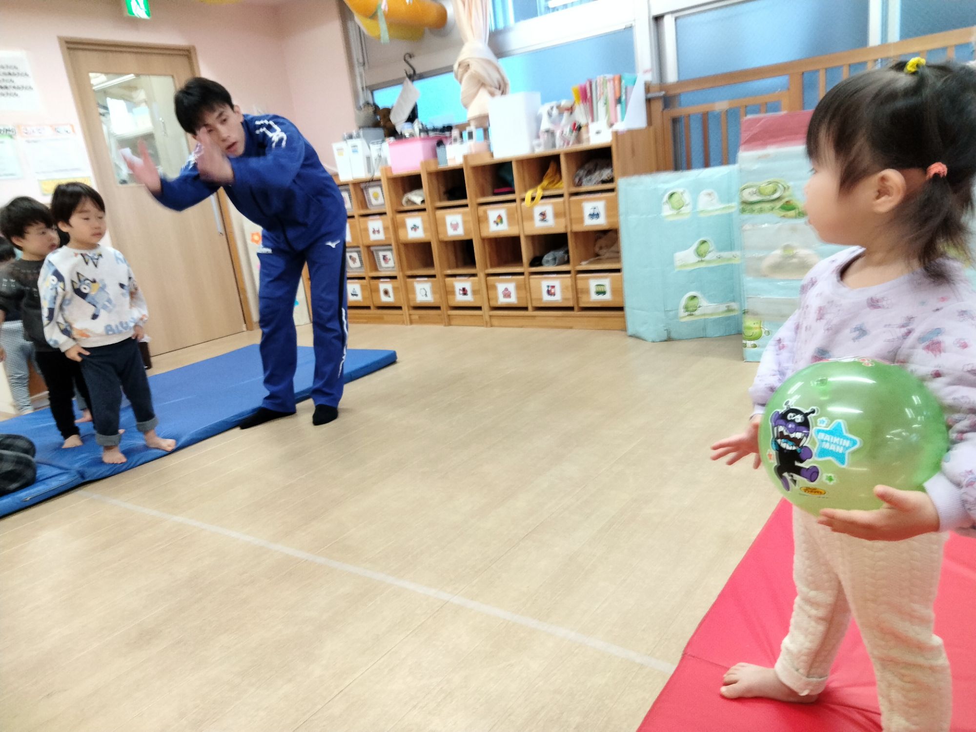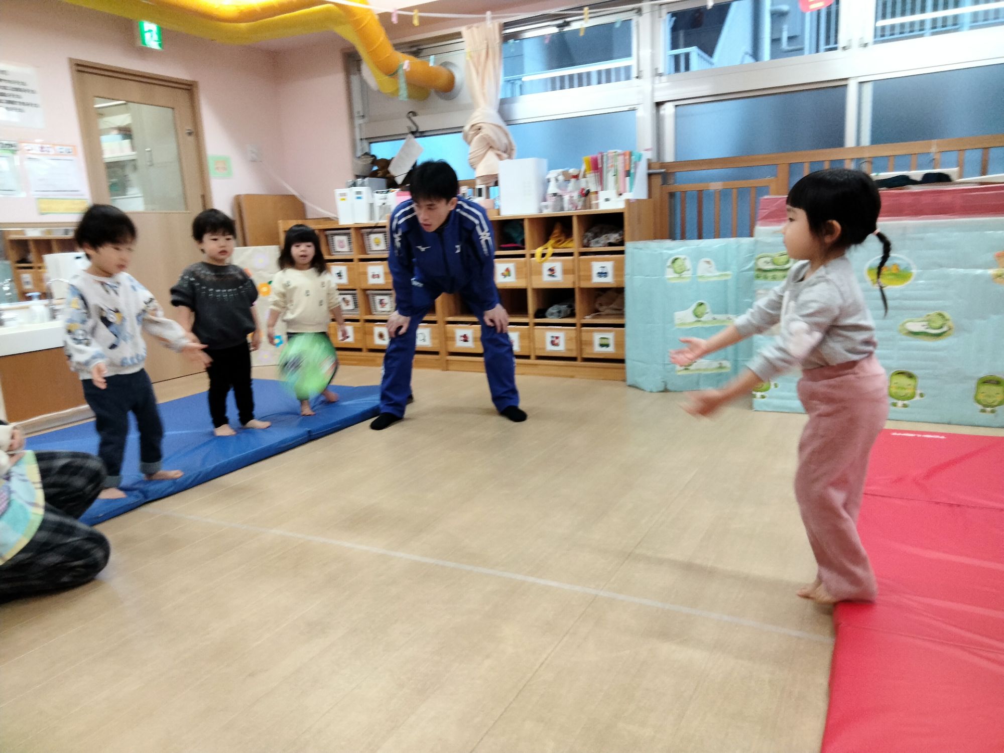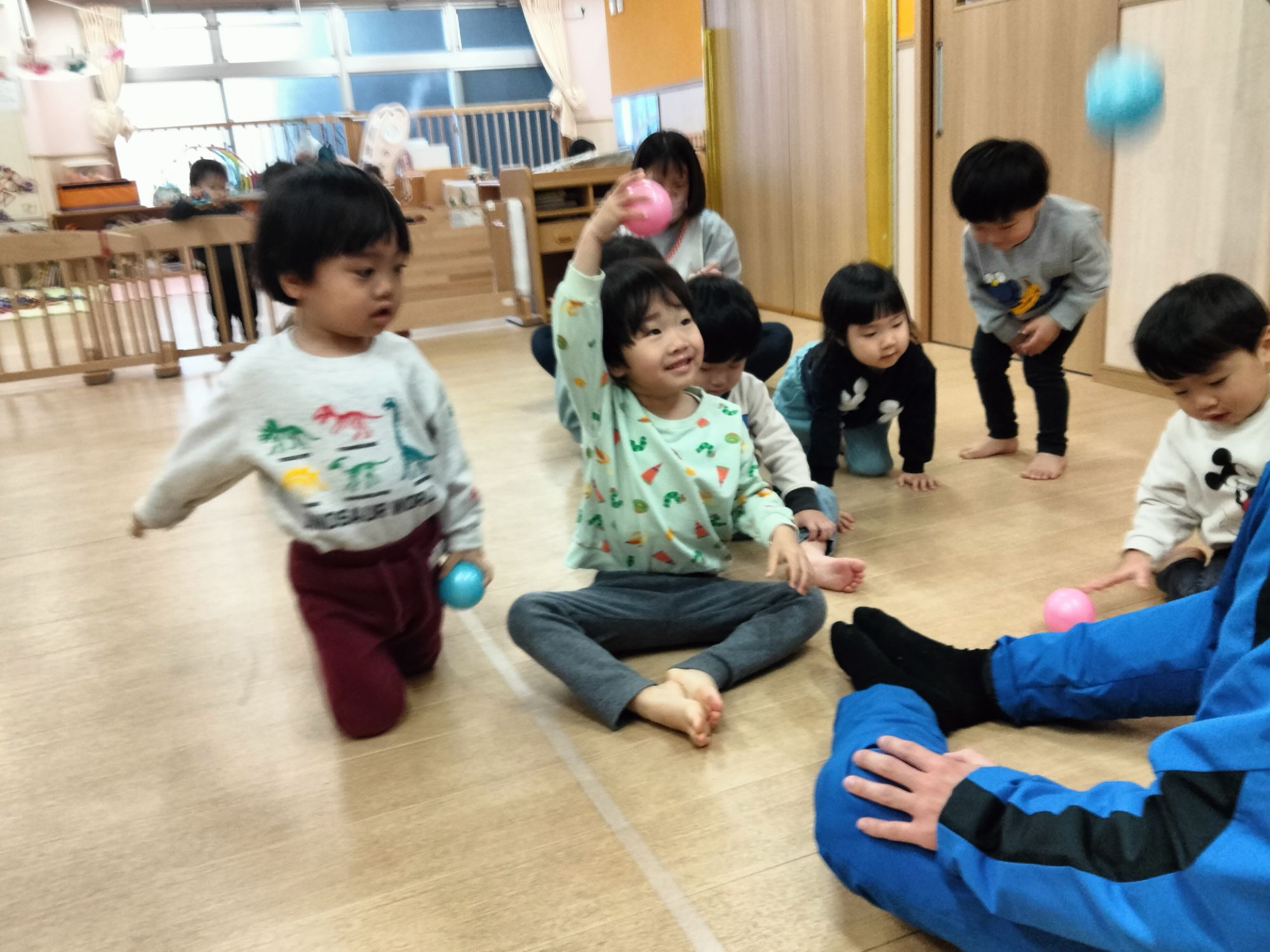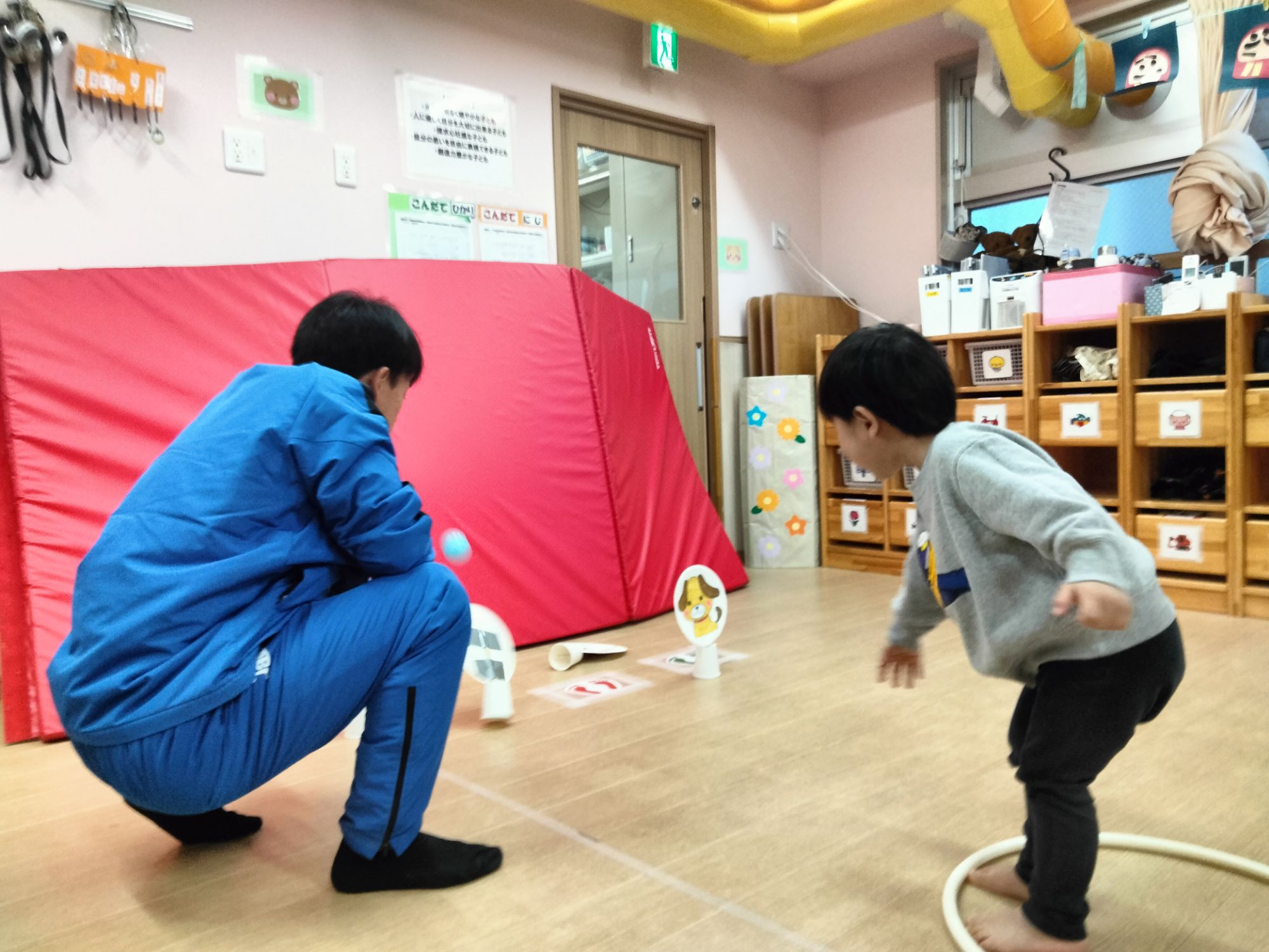 お友だちと青と赤のお部屋に分かれキャッチボールにもチャレンジ!