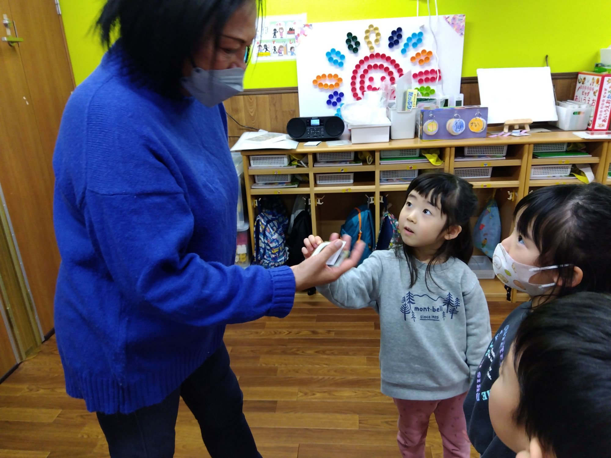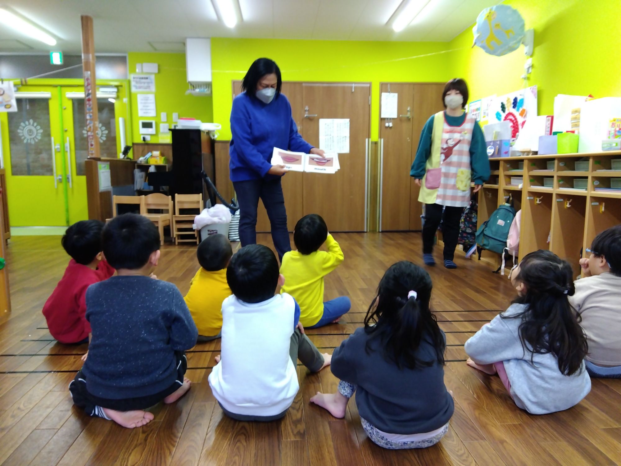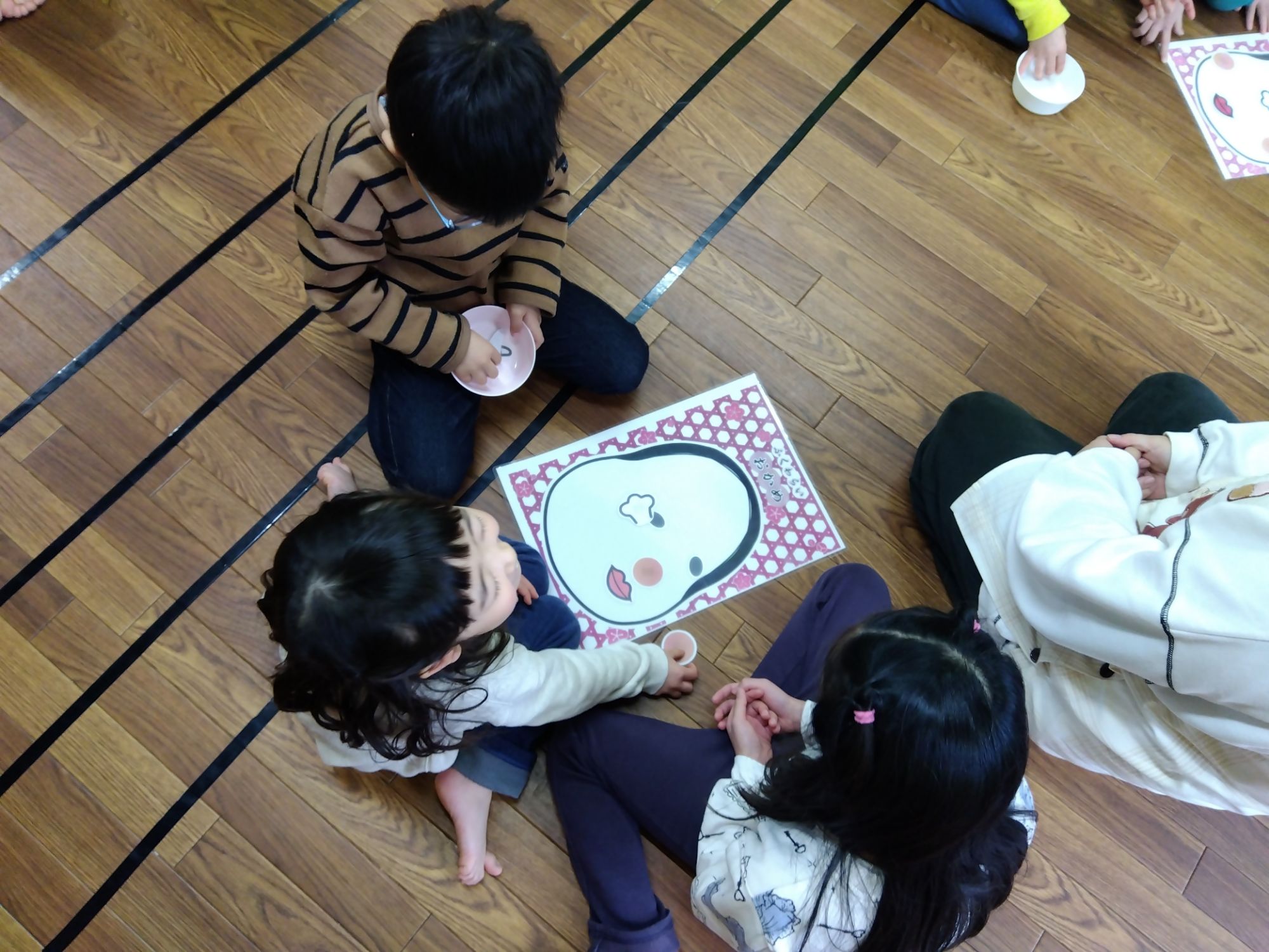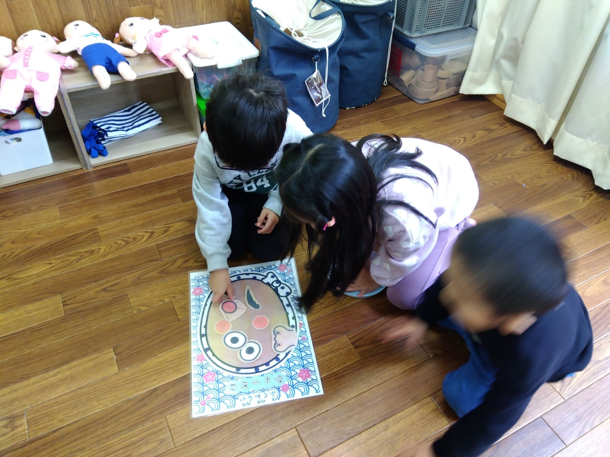こちらは『福笑い』お友達から“Cheek”“Eyebrow”と英語で教えてもらいながら、行います。英語と和のコラボレーション😊
