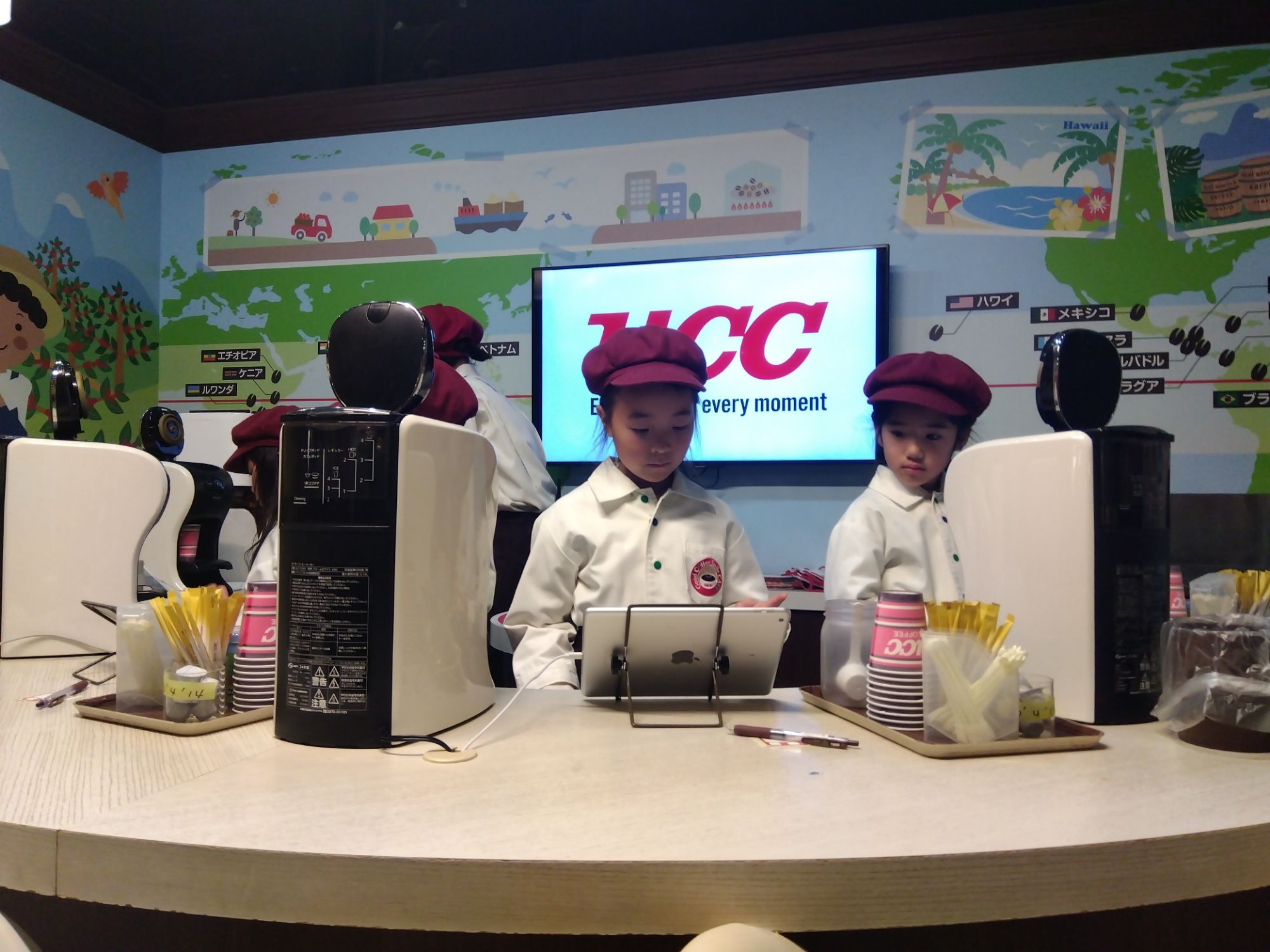 専用機械に入れてコーヒーが出来上がったらお客さんを呼んで☕コーヒーを提供😊「美味しい」「ありがとう」の言葉に嬉しそうな店員さん達でした☺️
