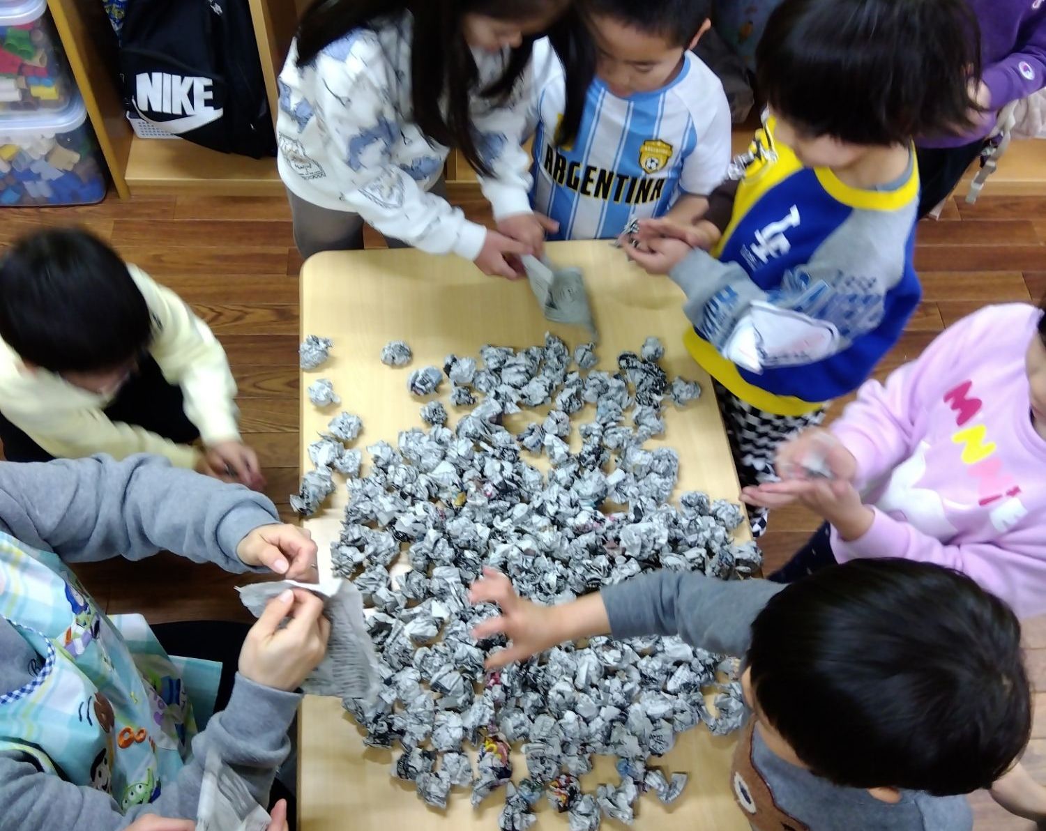 保育園では誤飲のリスクも考えて、本物の豆ではなく新聞を小さくて丸めて使用します。「やっつけるぞ〜!」の気持ちを込めて丸めます💪