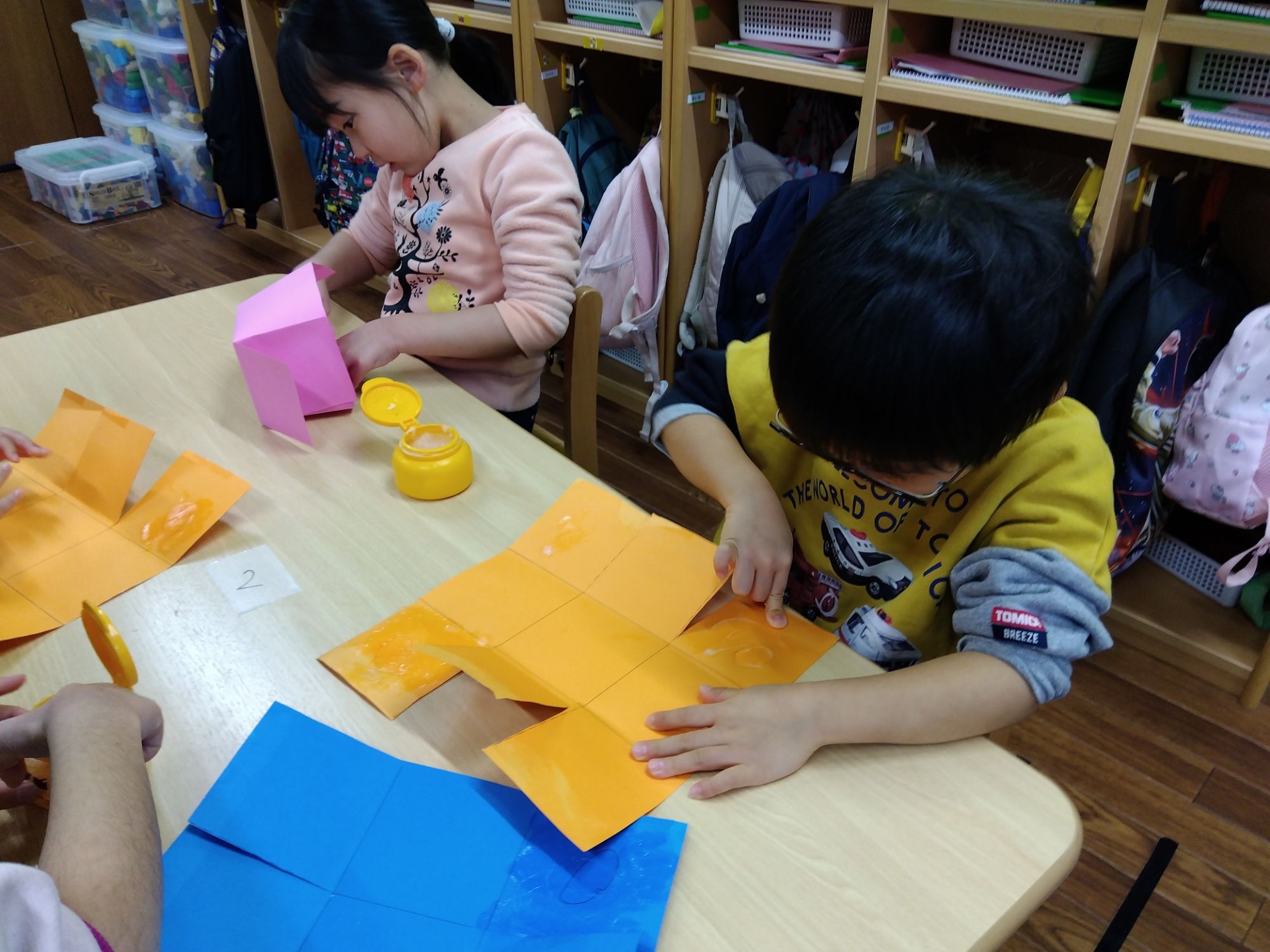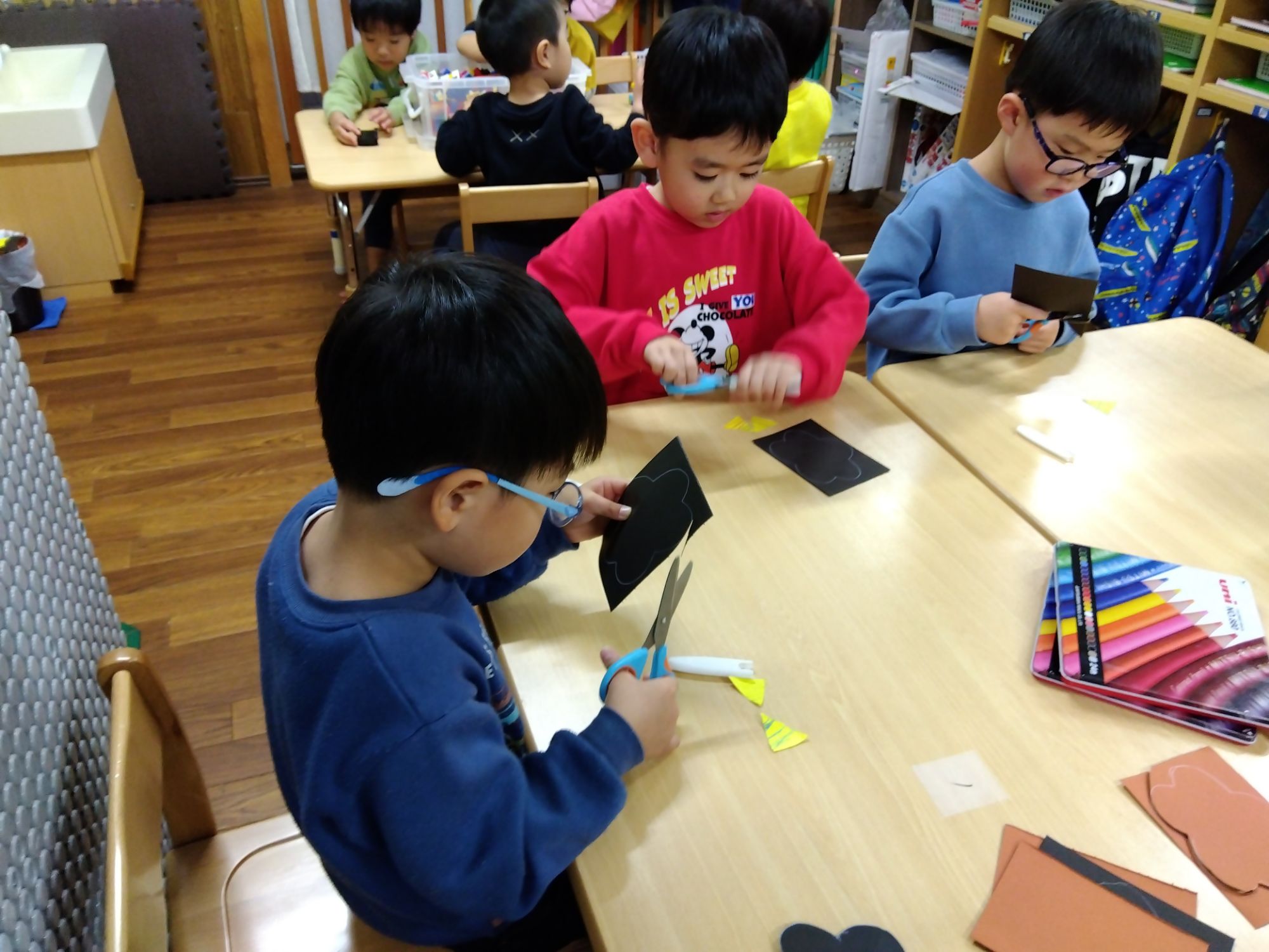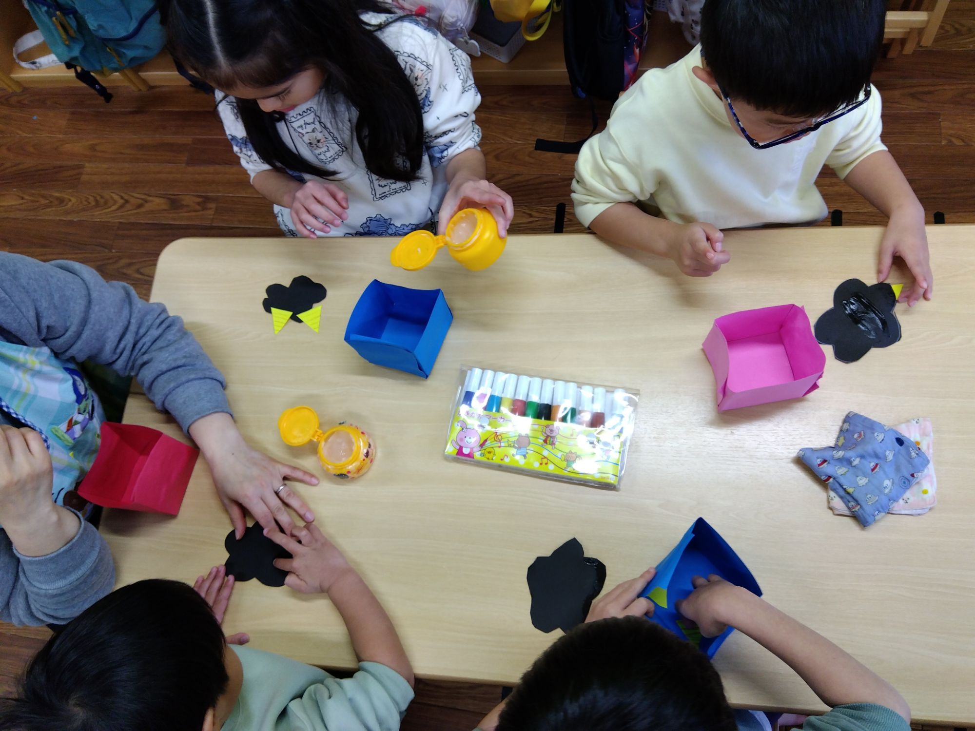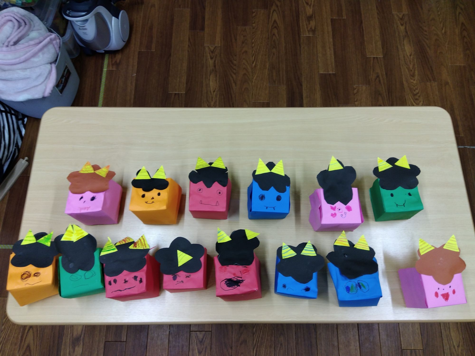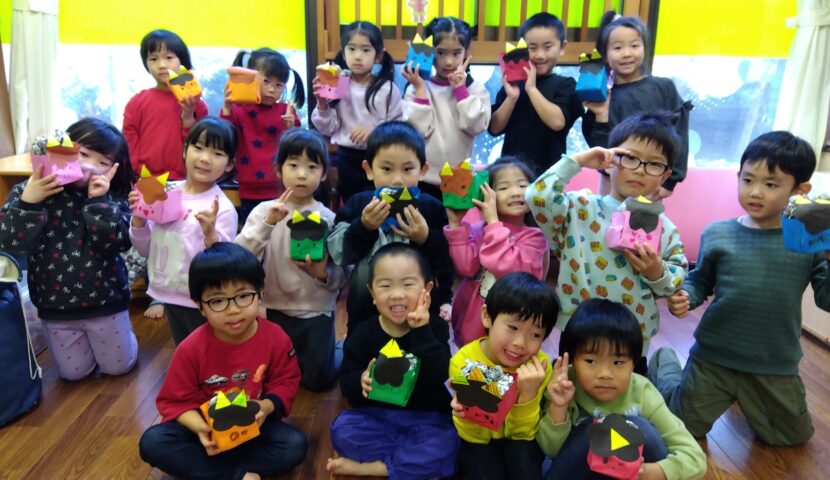 節分に向けての「豆入れ」を作りました。はさみ✂️で切り込みを入れてノリを塗って箱の形に仕上げます。