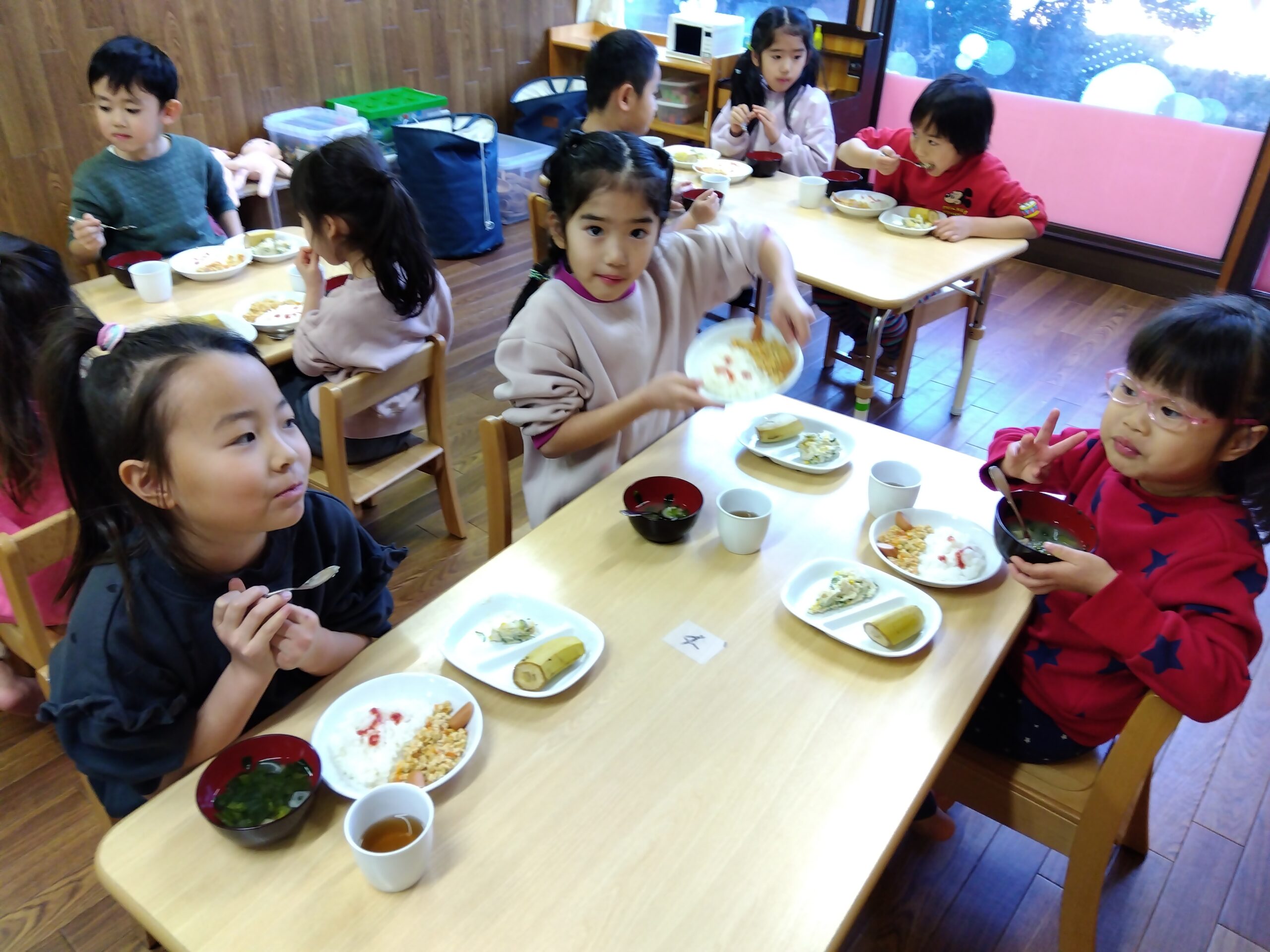 給食も節分にちなんで、オニさんライス👍🏻「かわいい💕」「こわくなーい」「おいしい」色々な感想が聞こえました。