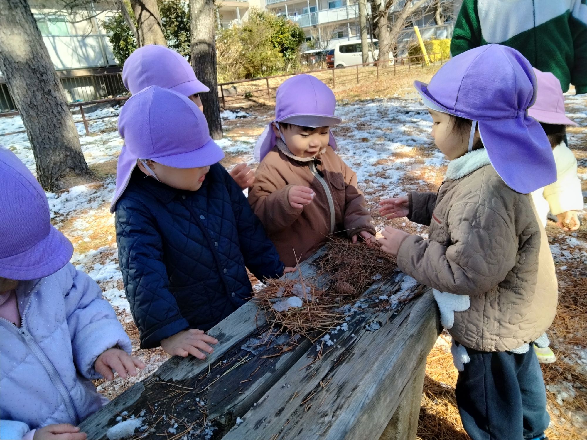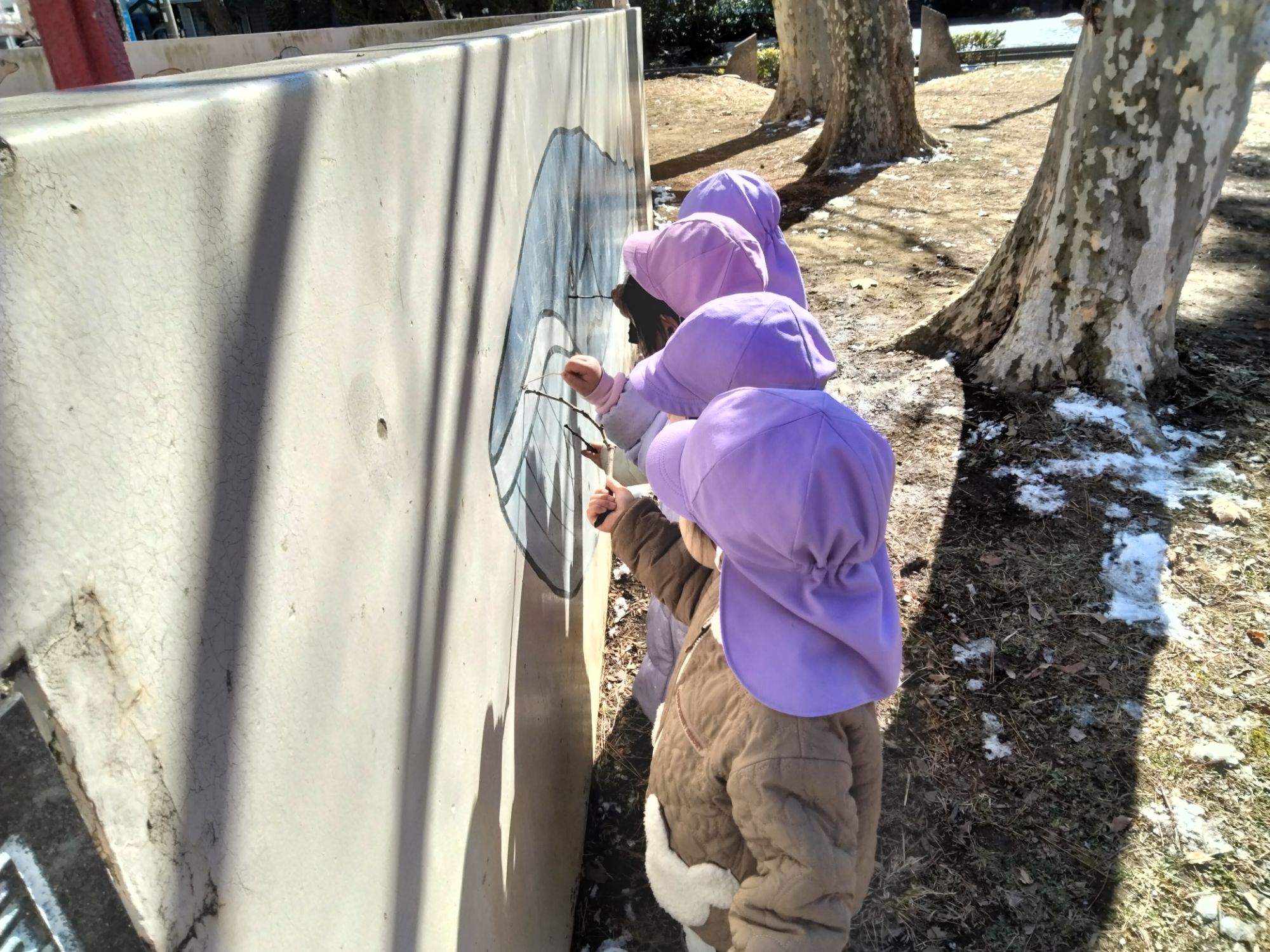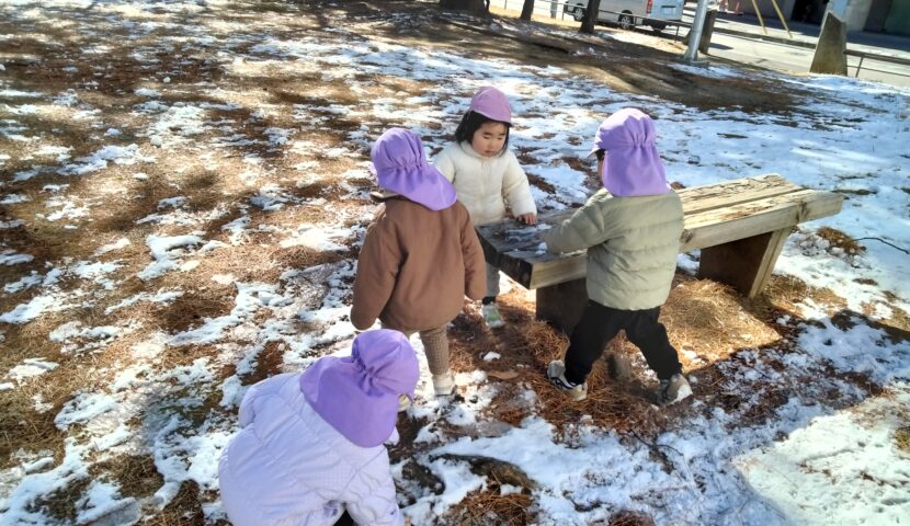 固まりになった雪を見つけ「みてみて〜!」「つめた〜い!」