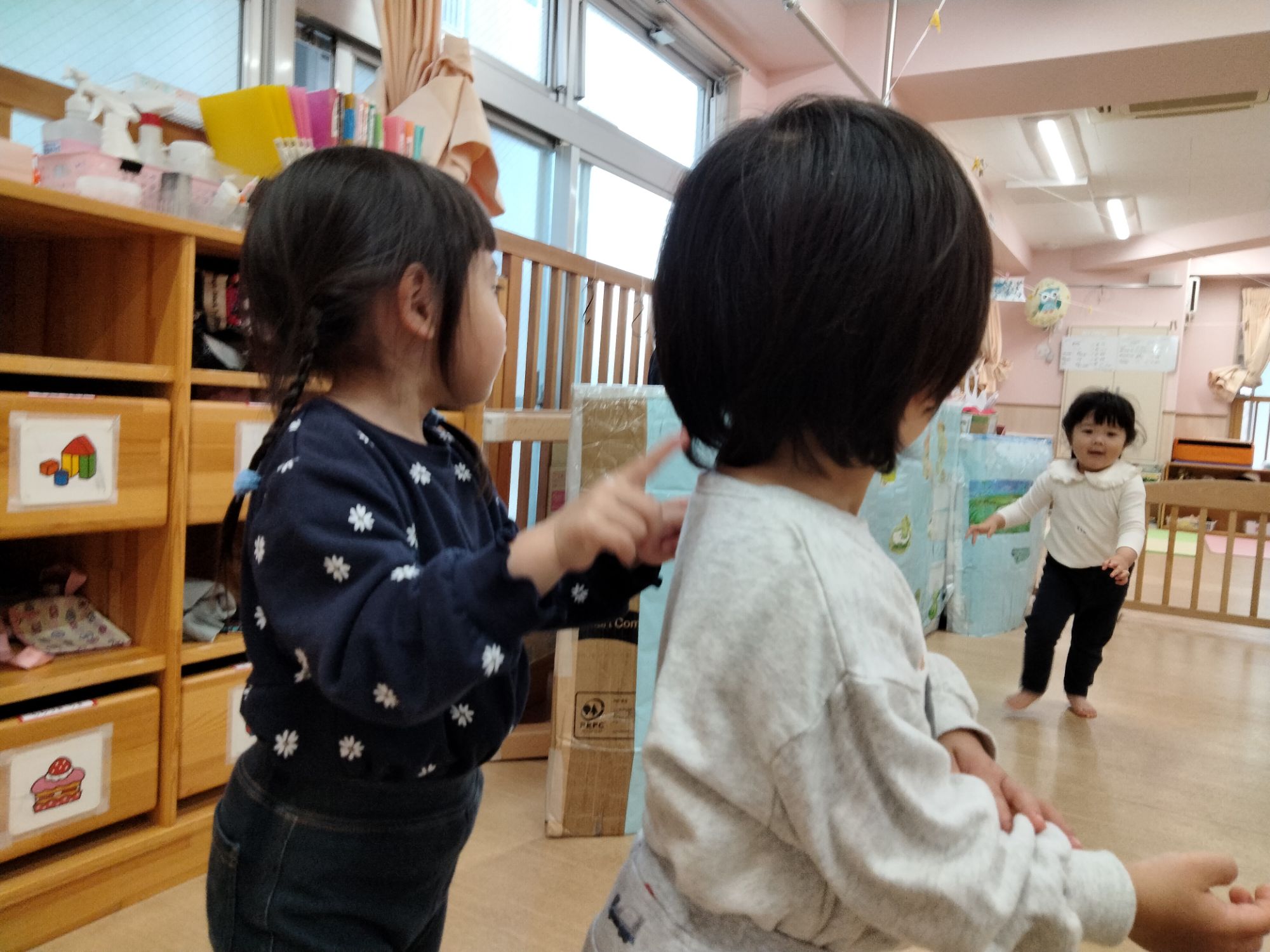 ツンツンツン🎶とさっきは自分のお顔を触ったけれど、今度はお友だちを優しく指でツンツンしたり