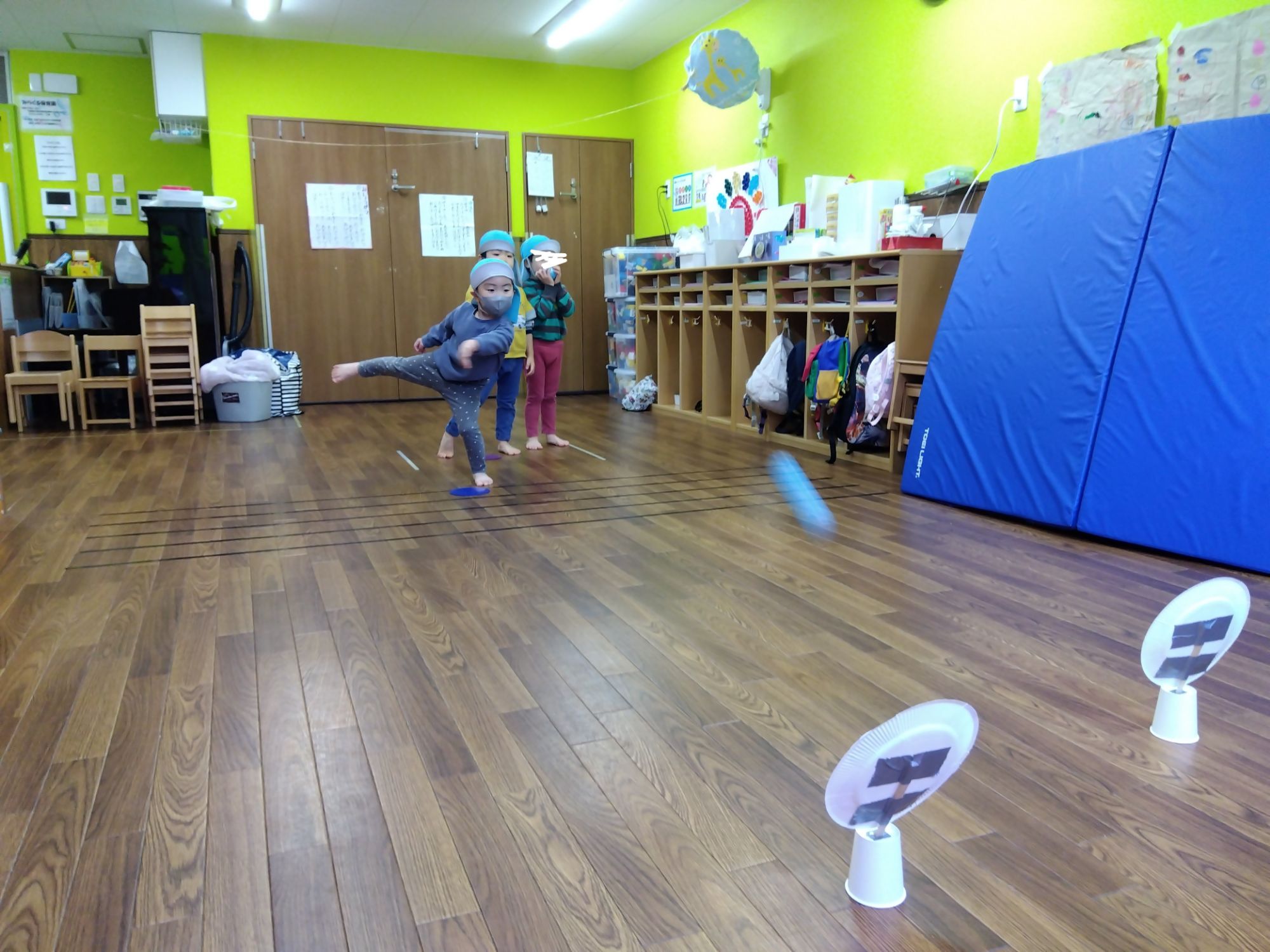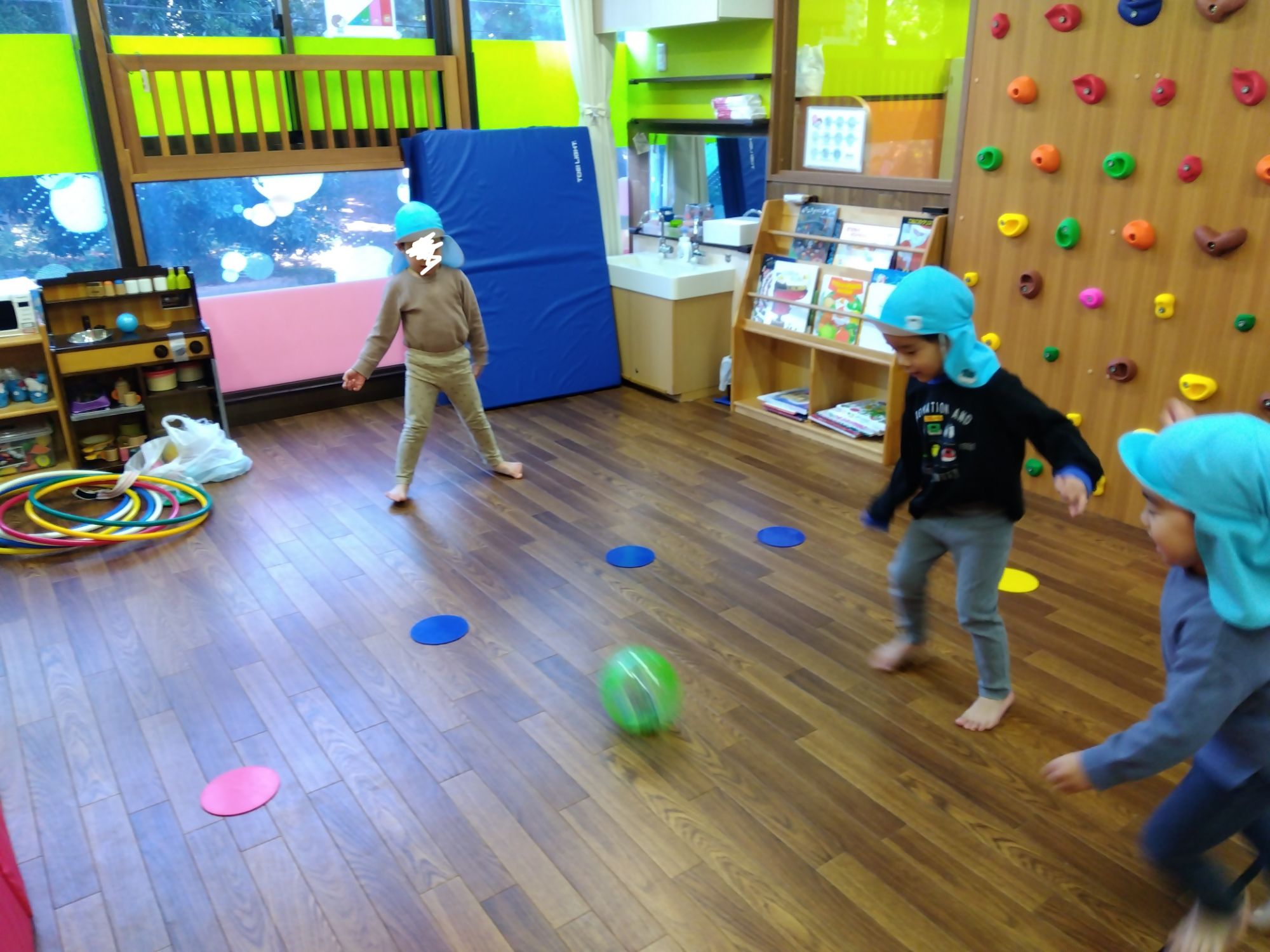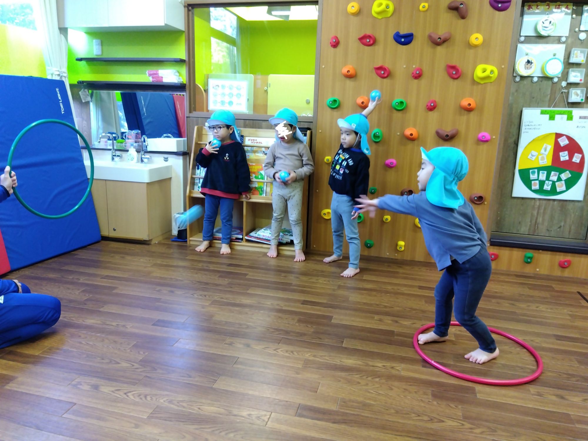 フラフープの的に当たるように投げてみます。よーく狙って「えいっ🤾」