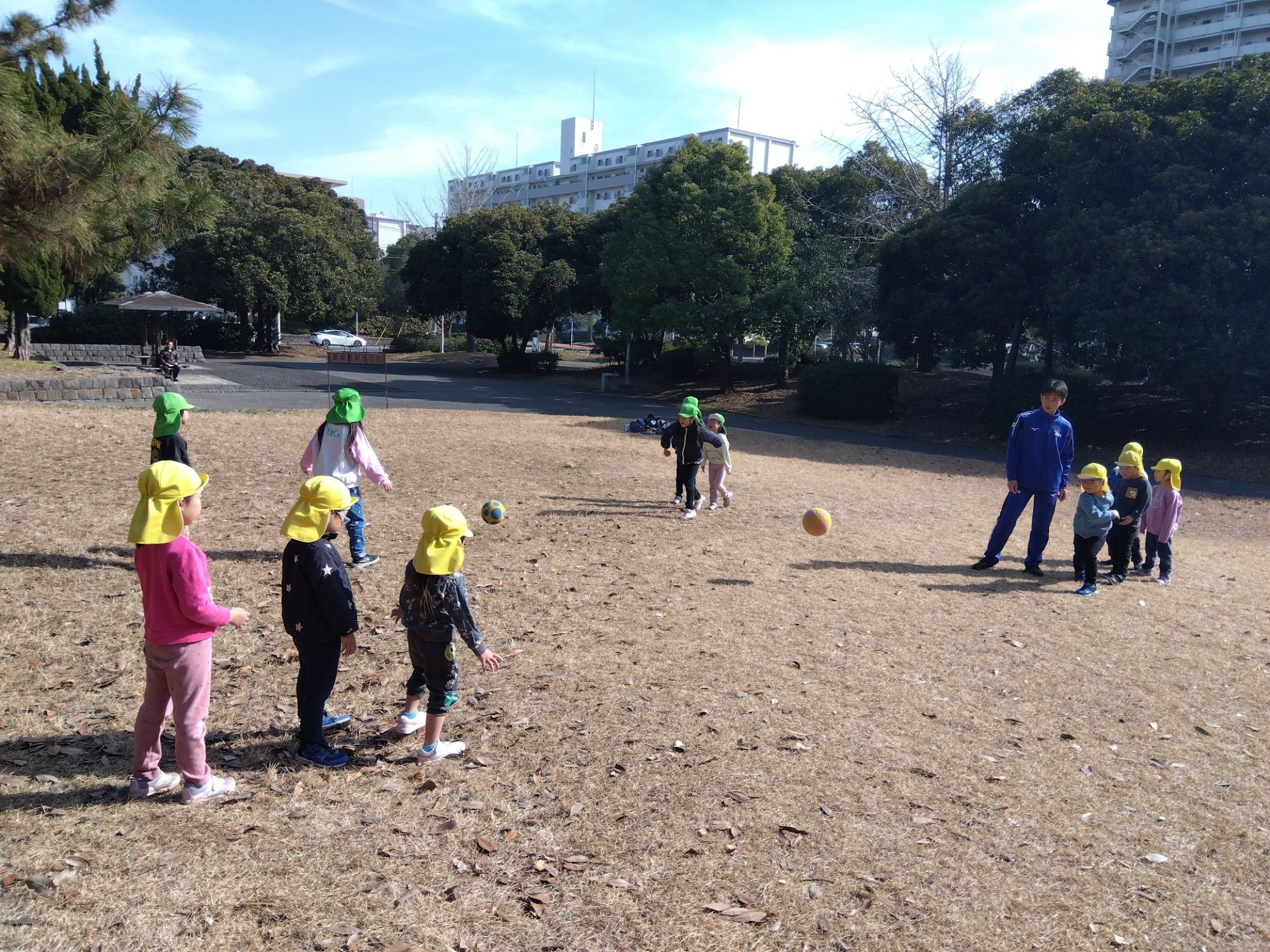 思い切りボール遊びをするために、公園でも体操を行いました!