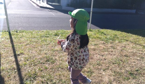 芝生の広場を走ってカードを取りに行き、選んだカードを発音!体を動かす楽しさを味わいながら英語も楽しめる活動です☺