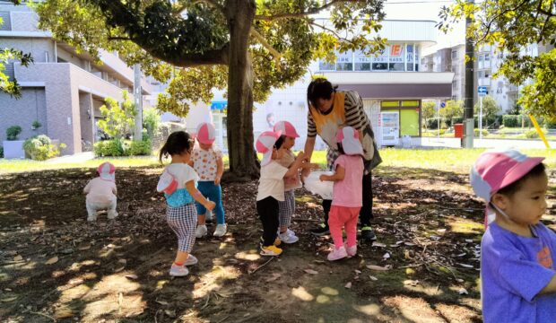 みんなで輪になり、しゃがんだり伸びたりしておもちが焼ける様子を表現しました🙌🏻全身表現を楽しめる活動です。