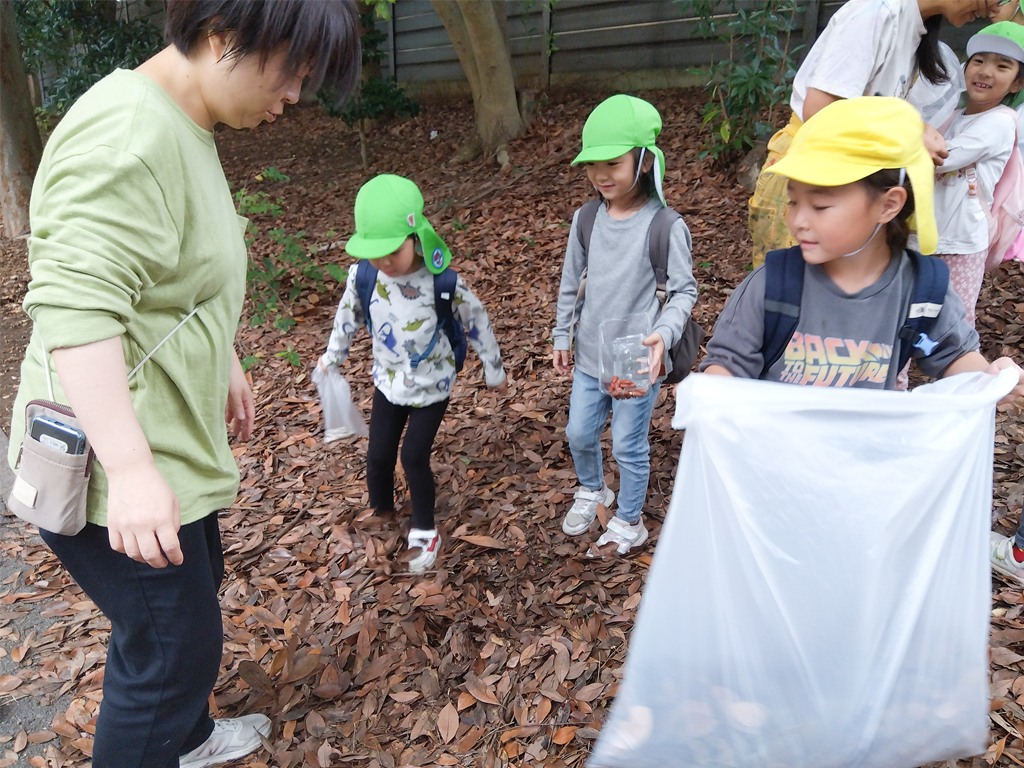 室内、戸外で音探し・楽器に使用する材料探し五感をフル活動させて普段は聞き流している様々な“音”を探しにいつものお部屋の中や緑地帯(保育園前に広がる緑地帯の公園)を探索!