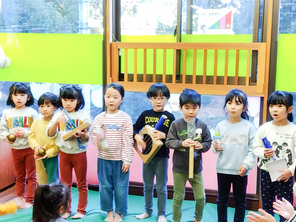 自分で見つけた“音”をお友達と言葉や行動で伝え合う楽しさを味わう。