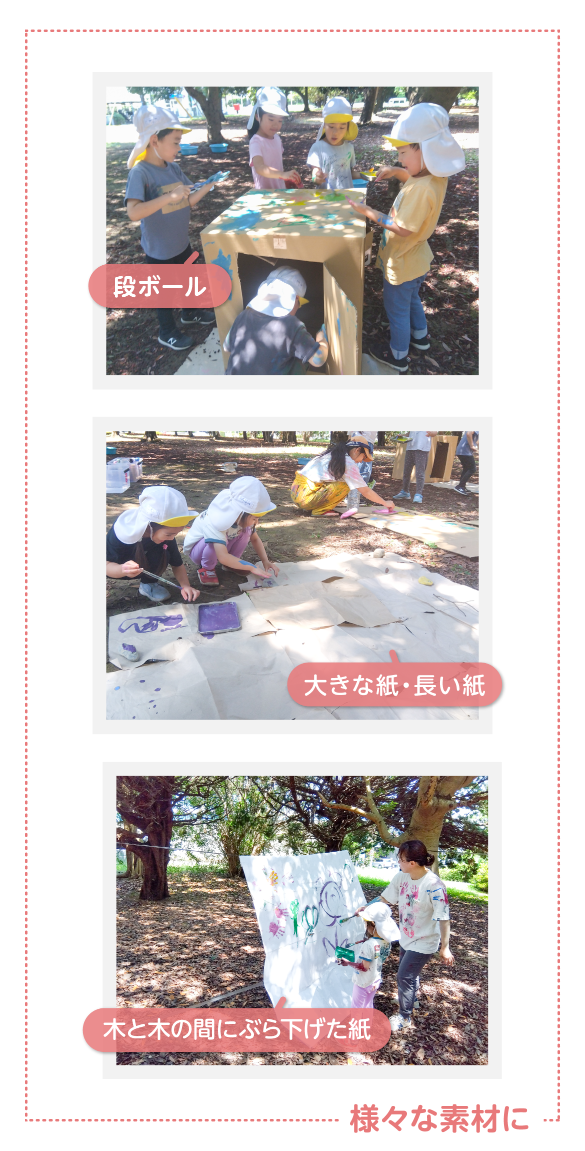 ・形あるものにこだわらず、五感を刺激した活動を通して様々な事象に興味・関心をもち、個々に自由に表現・創作する楽しさを味わう。同時に創作する過程や出来上がりを言葉にして伝え合うことで、相手の行動を受け止め認めあう大切さや相手の話をしっかり聞き、言葉で伝え合う楽しさを味わう。