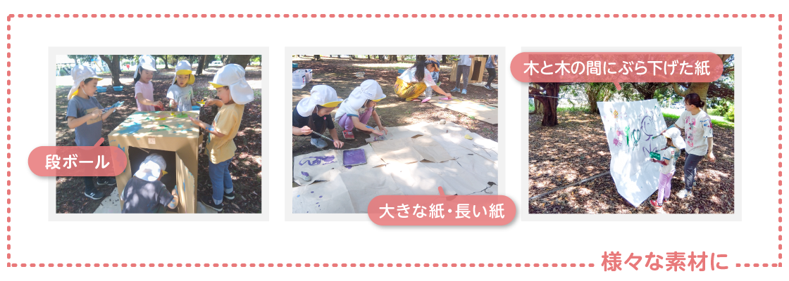 大人では思いつかないようなこどもたちの発想に、「そうきたかー!」と保育士の先生たちと一緒に驚き、楽しみ、面白がり、終わった後は先生たちとふりかえりの時間を設け、それぞれのこどもの様子についてじっくりと話し合うことを大切にしています。