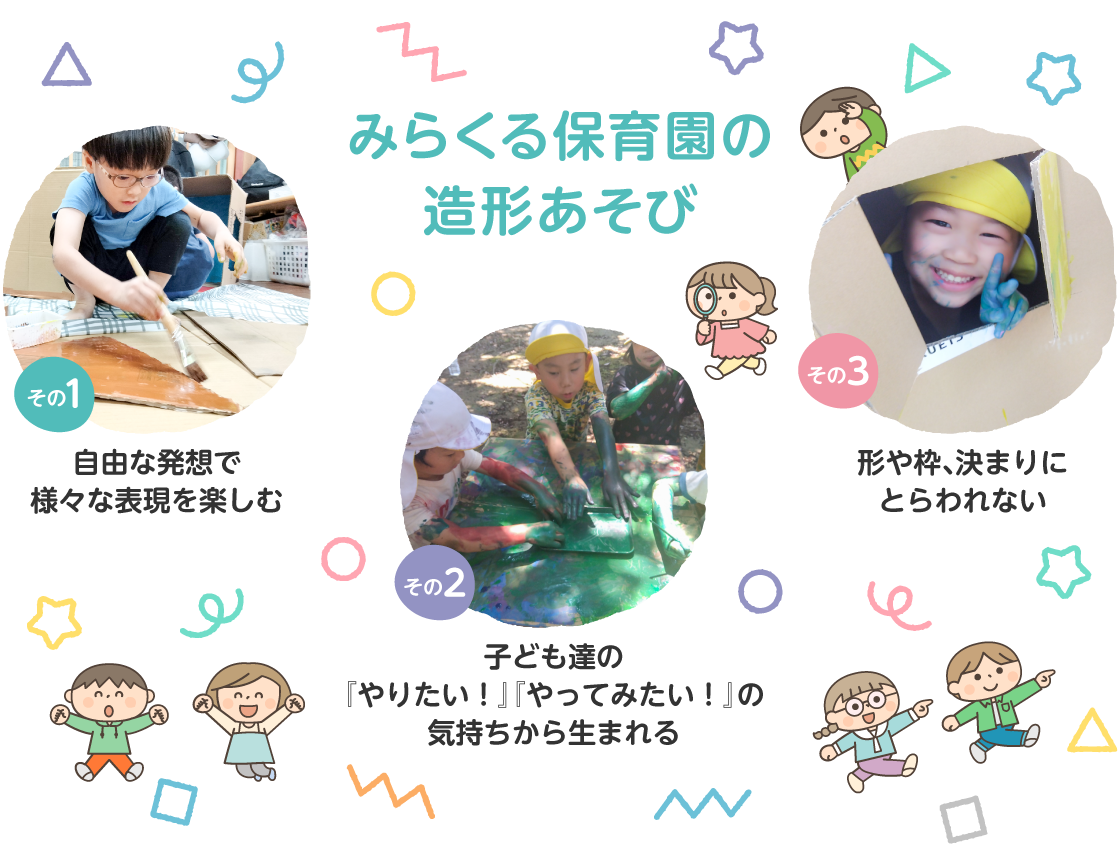※自主的に規律やルールを守り行動することができるようになるこの時期に、普段は使用しない道具や素材・手法を駆使して創作活動を楽しみます!