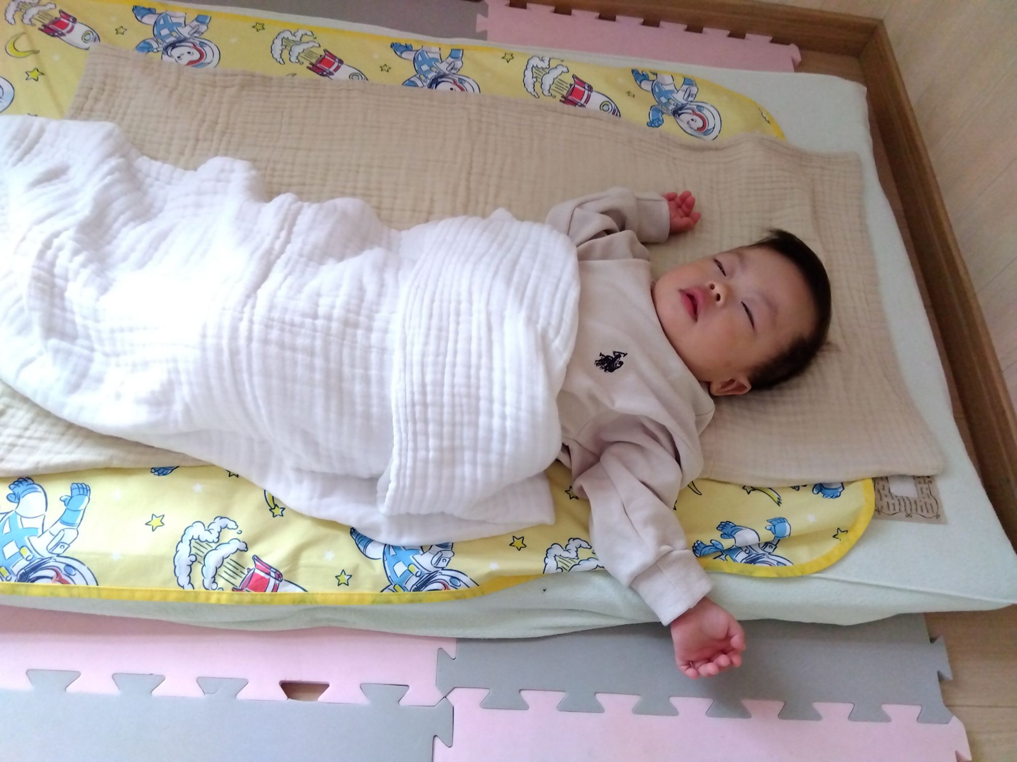 お布団でトントン…抱っこで寝んねしてからお布団やラックで…ラックでゆらゆら…おんぶで寝んね…添い寝で寝んね…など、寝つき方は様々です!