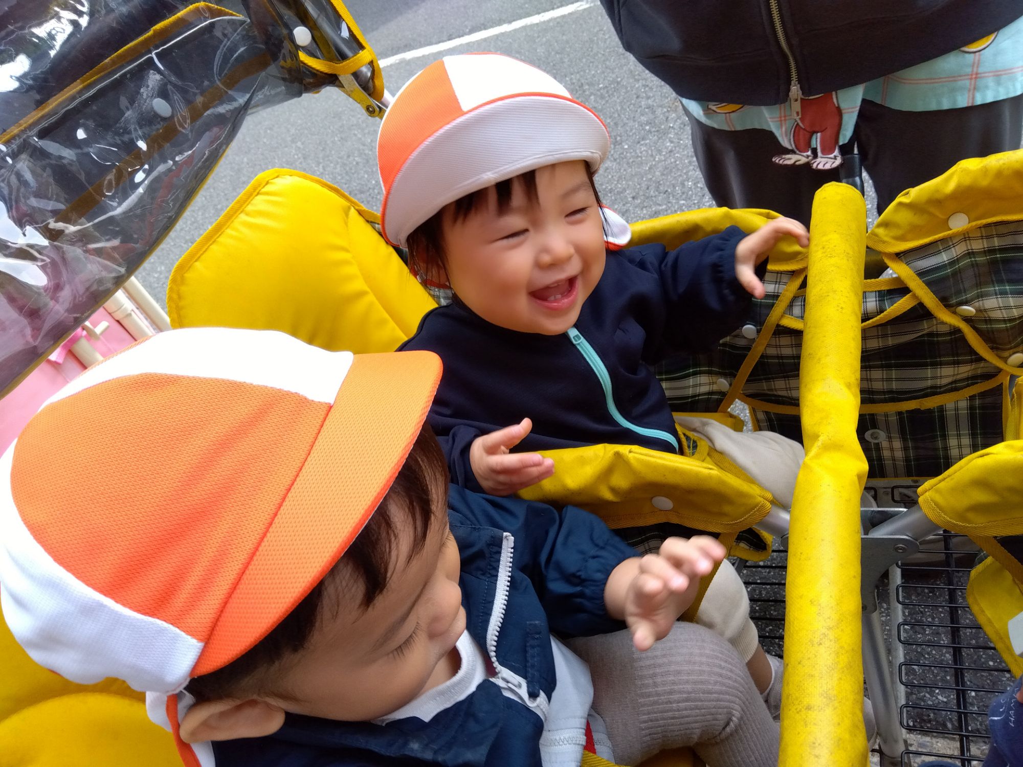 4人乗りのベビーカーに乗ったり、おんぶ紐を使って保育者の抱っこ・おんぶで外気浴や外遊びを楽しみます!